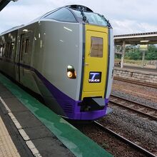 10月中旬の平日、追分駅16時39分発の、特急とかち5号に、終点の帯広駅までの区間乗車しました。列車には、白をベースに、紫のラインが入った外観の、261系が充当されていました。リクライニングシートは快適で、帯広までストレス無く移動できました。