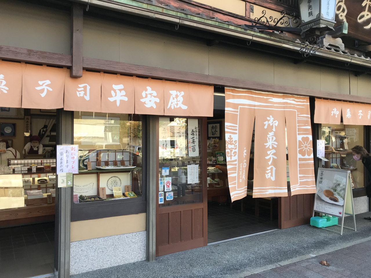 平安殿 本店は、昭和26年創業で、平安神宮の大鳥居へと続く神宮道にお店を構えています。今回購入したのは、平安殿と平安饅頭。平安殿は、香ばしい焼皮と柚子の香り高い白餡とのバランスがよく、とても上品な和菓子でした。平安饅頭は、カステラボーロ風の生地を使ったお饅頭です。外皮は、お口に含むと、とろける焦がしザラメ風味。中の黄身餡は、ホクホクした食感と、しっとりとした甘味を感じられました。