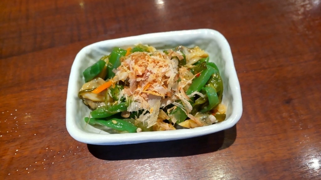 お通しで出てきたオクラとめかぶのワサビ和え。