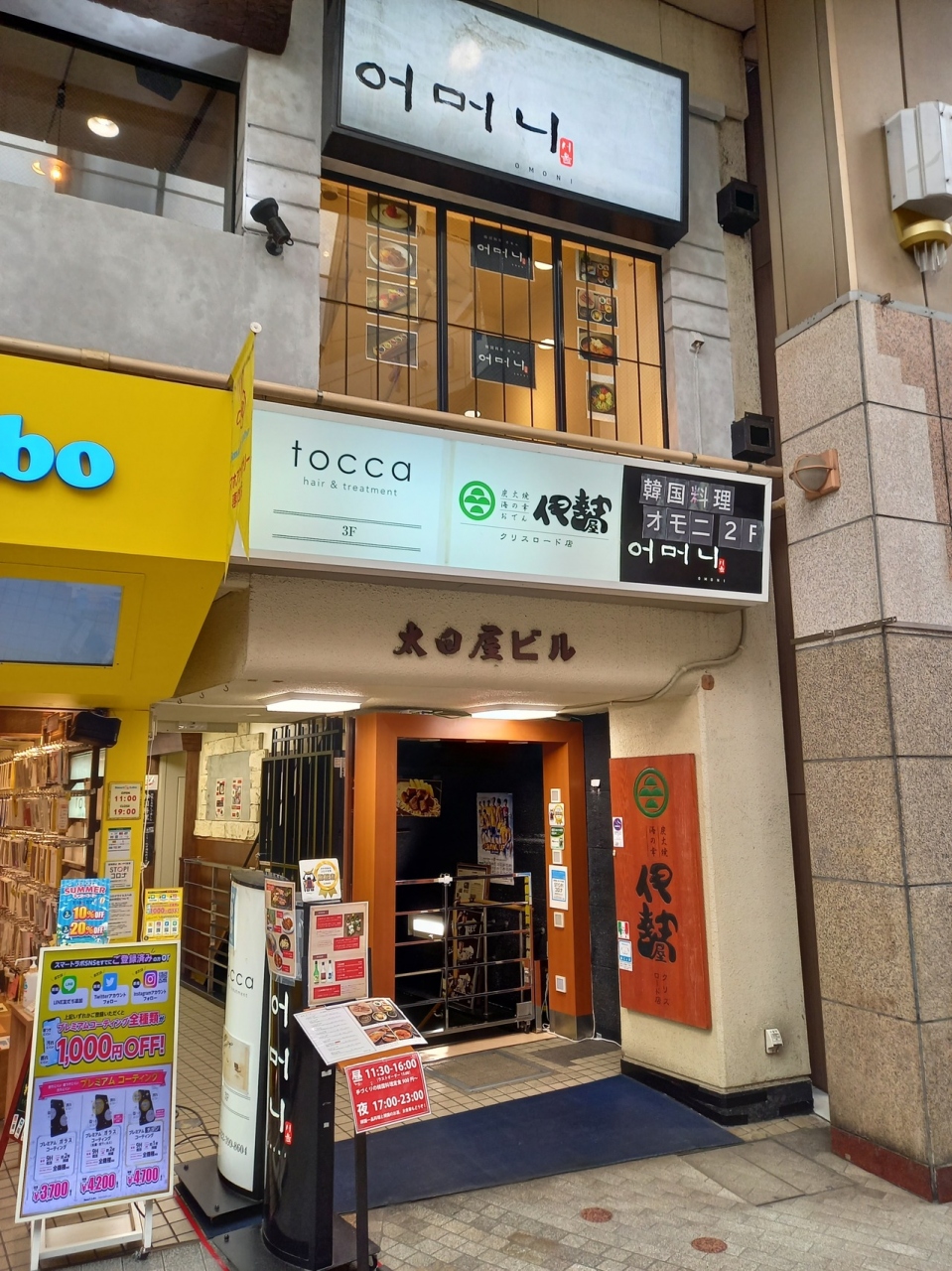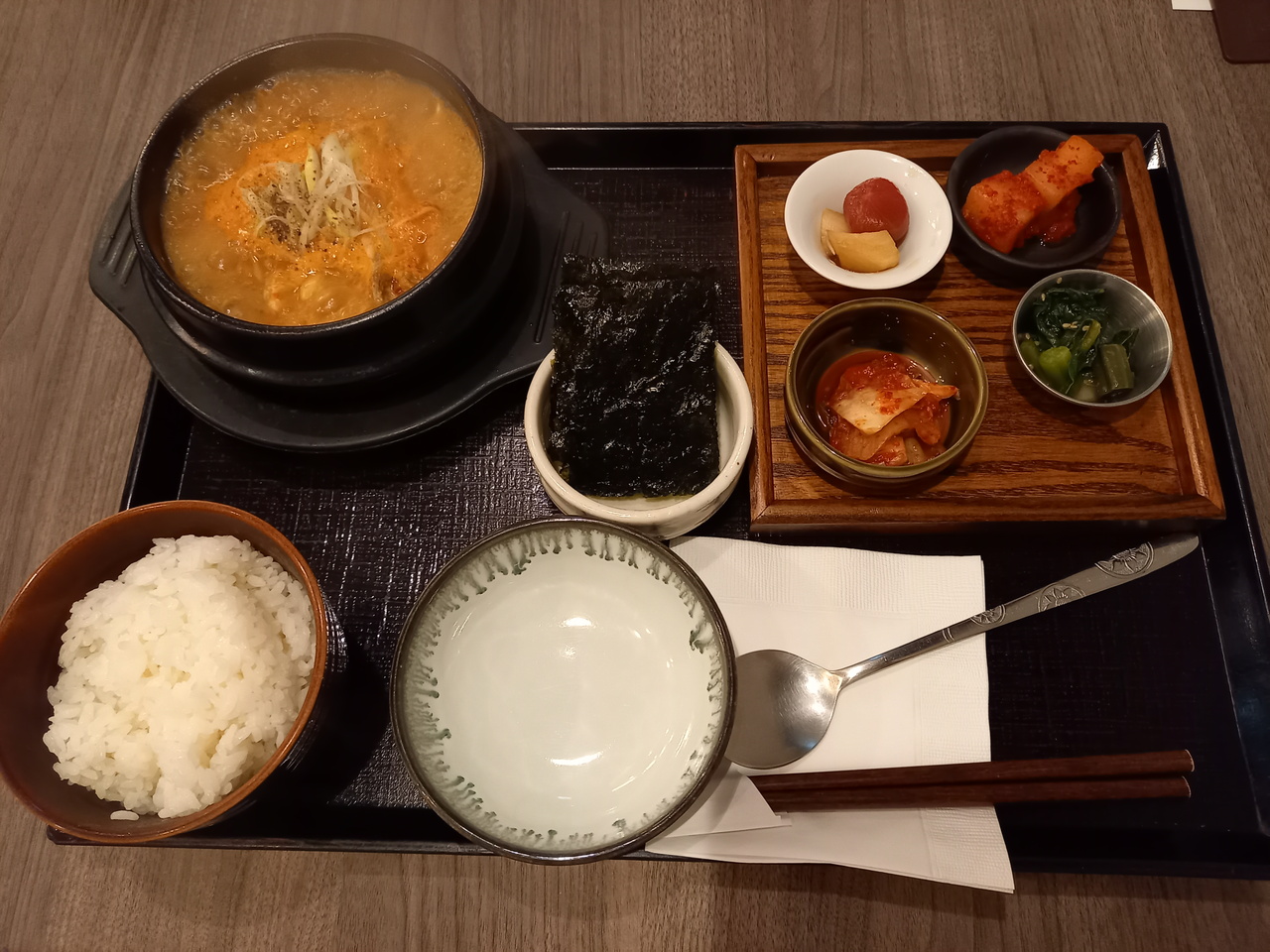 クリスロード商店街にあります。ビルの2階です。店内はシックな韓国風でテーブル席60席位はあります。ランチはスンブゥドゥチゲ定食900円からヤンニョムセウ定食1480円まであります。今回は、ユッケジャン定食950円をいただきました。ご飯はお代わり無料です。豆もやしが良い食感でした。スープは良い出汁出てました。