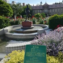 細長い大通り公園の西の端にあります。噴水の中央に設置されています。この辺りはバラ園になっていて、7月の訪問時、きれいに咲いていました。この像の向こうには、札幌資料館があり古い建物がいい背景になっていました。