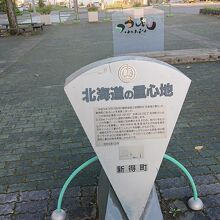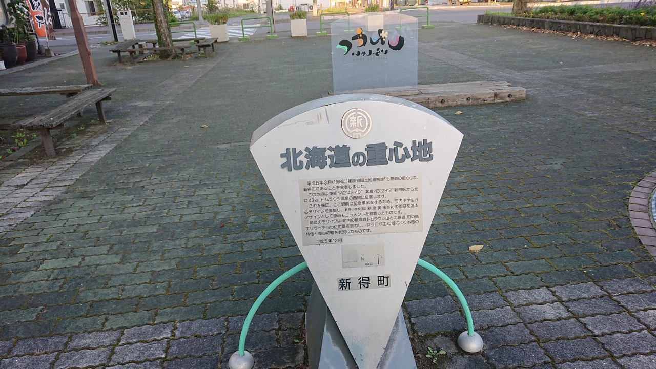 新得駅前に設置されているモニュメントです。10月上旬の平日の午後4時台に訪問しました。案内板の表示によると、平成5年に、国土地理院から、北海道の重心は、新得町に存在する、との発表があったのを記念して設置されたとのこと。ユニークだな、と感じました。
