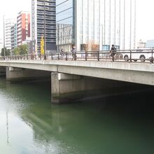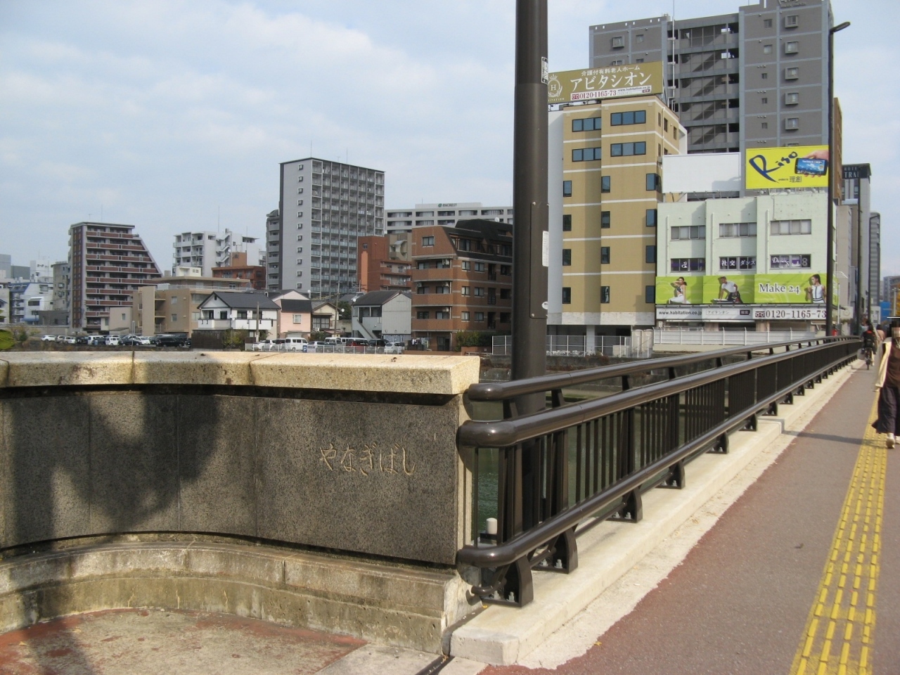住吉通りが那珂川を渡る橋です。幹線道路なので車の交通量は多いですが、見た目では、長さ的にもデザイン的にもこれと言った特徴は無く、ごく平凡な橋です。橋の上から見る那珂川も水がよどんでいて特別景観的に見所は無かったです。