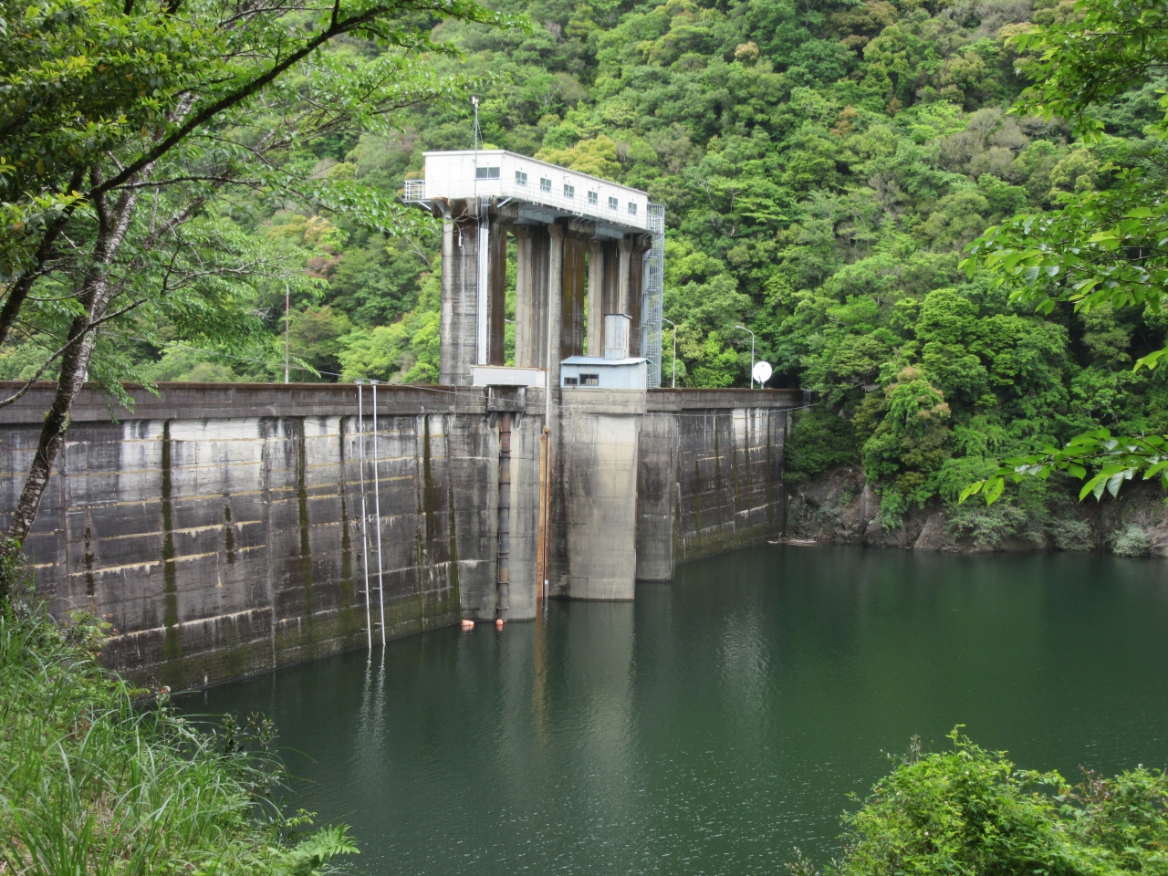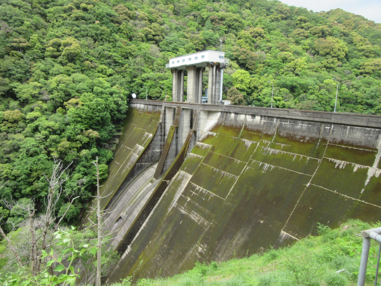 ダム天端は立入禁止なので、ダム左岸よりダム下を望むと緑が深くてよく見えませんが、小さな減勢工があるだけで、大きな施設は無い様です。多雨地域なのでダム堤体が緑になる位苔生しているのが印象的でした。