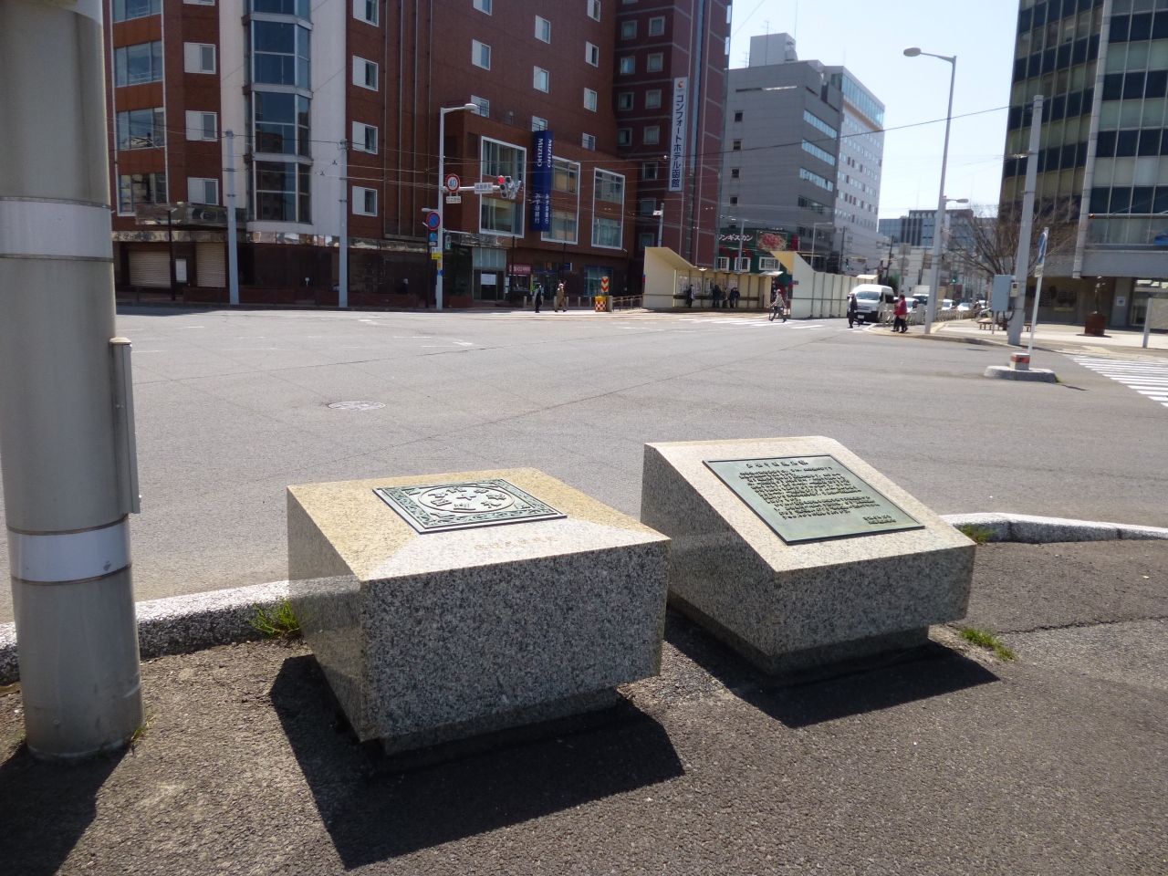 函館駅前広場、南東角、函館駅前交差点のところに、函館市国道元標が立てられています。函館市から札幌市中央区に至る一般国道5号と函館市から亀田半島の海岸線を回り、茅部郡森町に至る一般国道278号、函館市から青森県上北郡野辺地町に至る一般国道279号の起点になるところだそうです。
