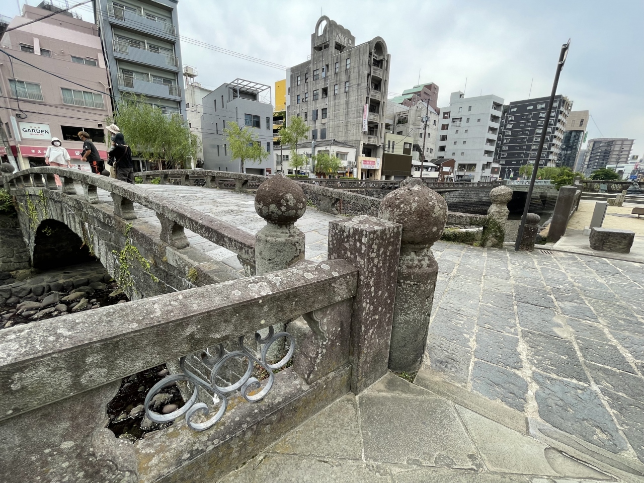 中島川には日本最古の石造りアーチ橋として有名な眼鏡橋をはじめ、多くの石造りの橋が架かっています。川沿いは遊歩道兼公園となっていて、散策しながら橋を眺めることができます。公園は綺麗に整備されていて、趣ある石橋の風景と共に写真を撮る観光客で賑わっていました。