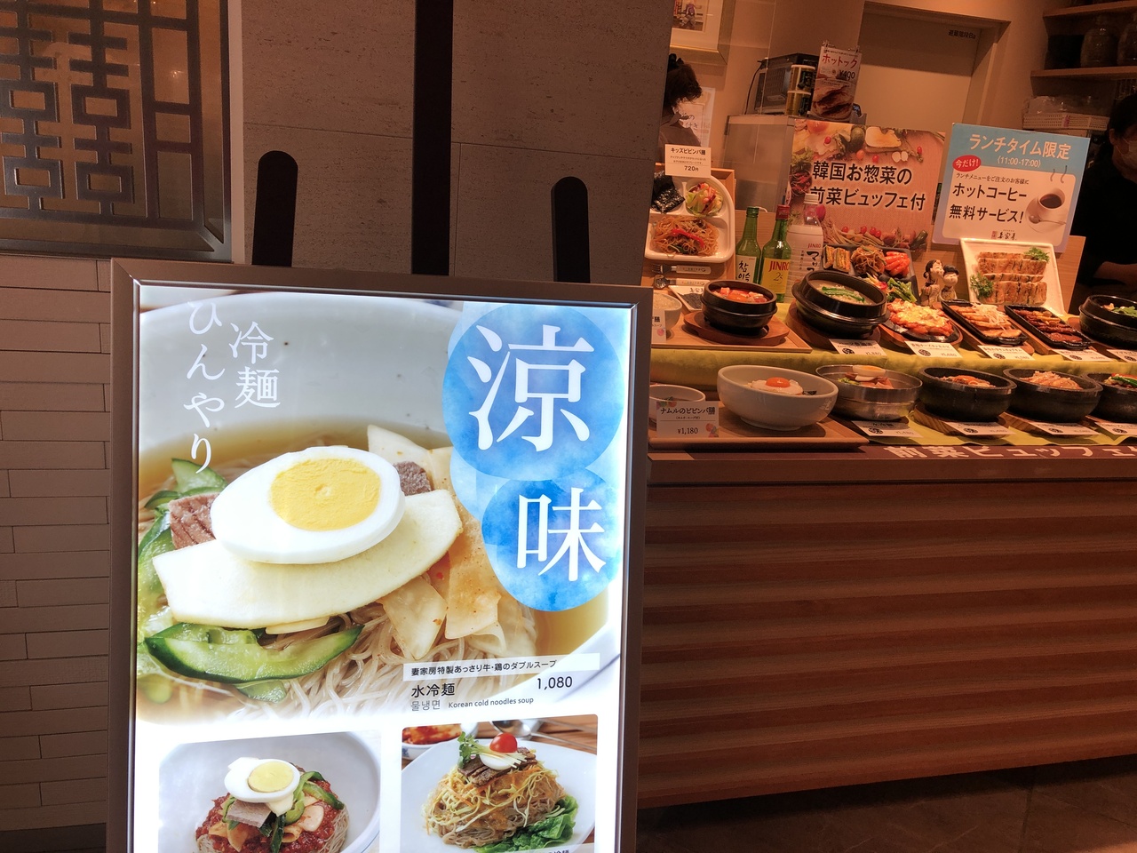 調布トリエのレストランフロアにある韓国料理のお店です。前菜のビュッフェがありサラダやチヂミなど食べ放題です。メインに水冷麺をオーダー。牛と鶏の出汁が効いたスープが美味しかったです。夏にぴったりで喉越しよくサラサラ食べられました。