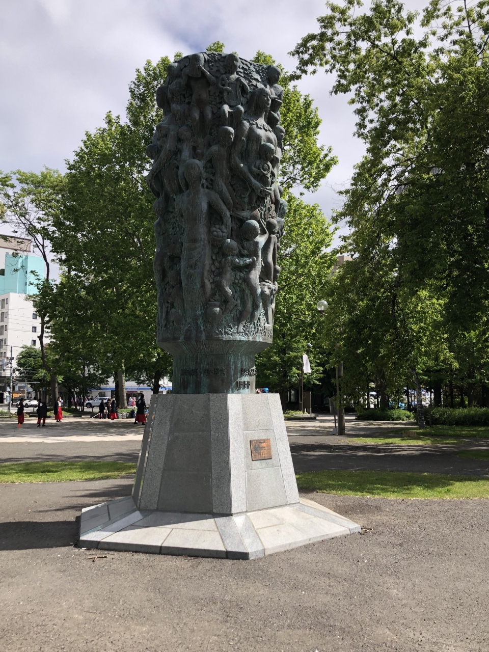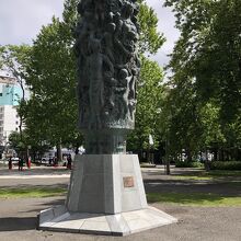 中島公園の北側にある広場に設置されています。遠くから見ると、円筒のようにも見えますが、近付いてよく見ると、何人もの人物が彫られていることがわかりました。女性や子供など様々です。かなり大きい像なので目立つ存在でした。