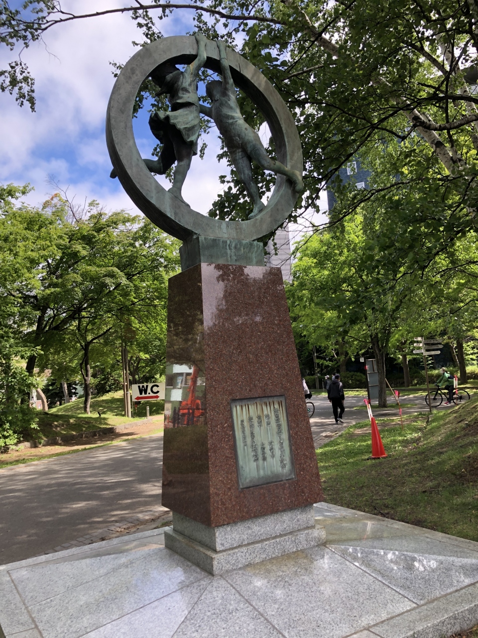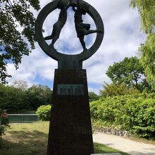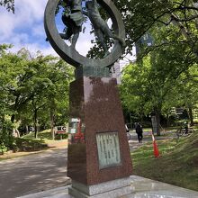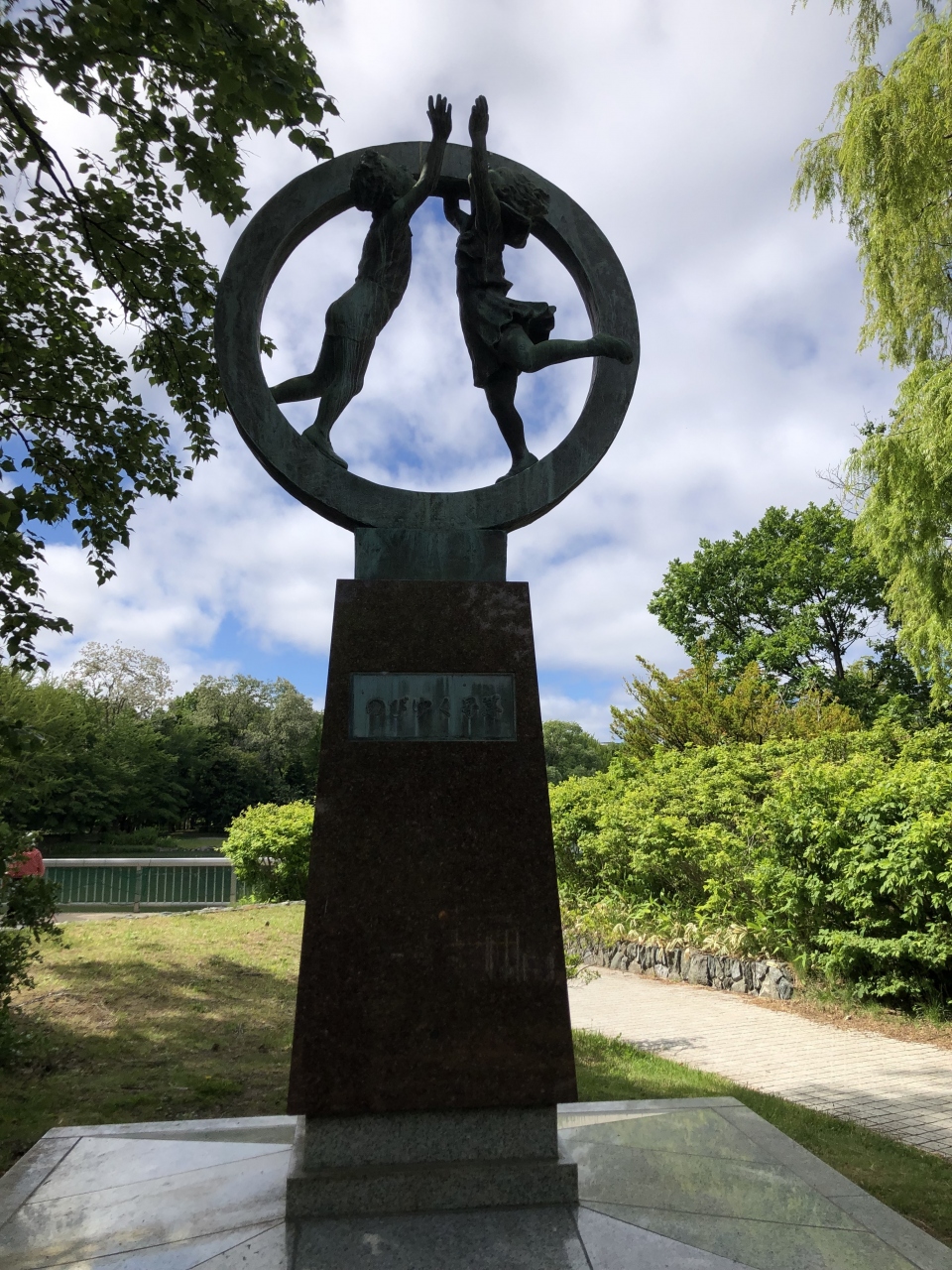 中島公園の菖蒲池前に設置されていました。男女の子供が、空に向かって手を伸ばしている像で、希望が感じられ、全体的にも躍動感のある像でした。子供達が輪の中にいるのもバランスが良いです。青い空をバックに絵になる風景でした。