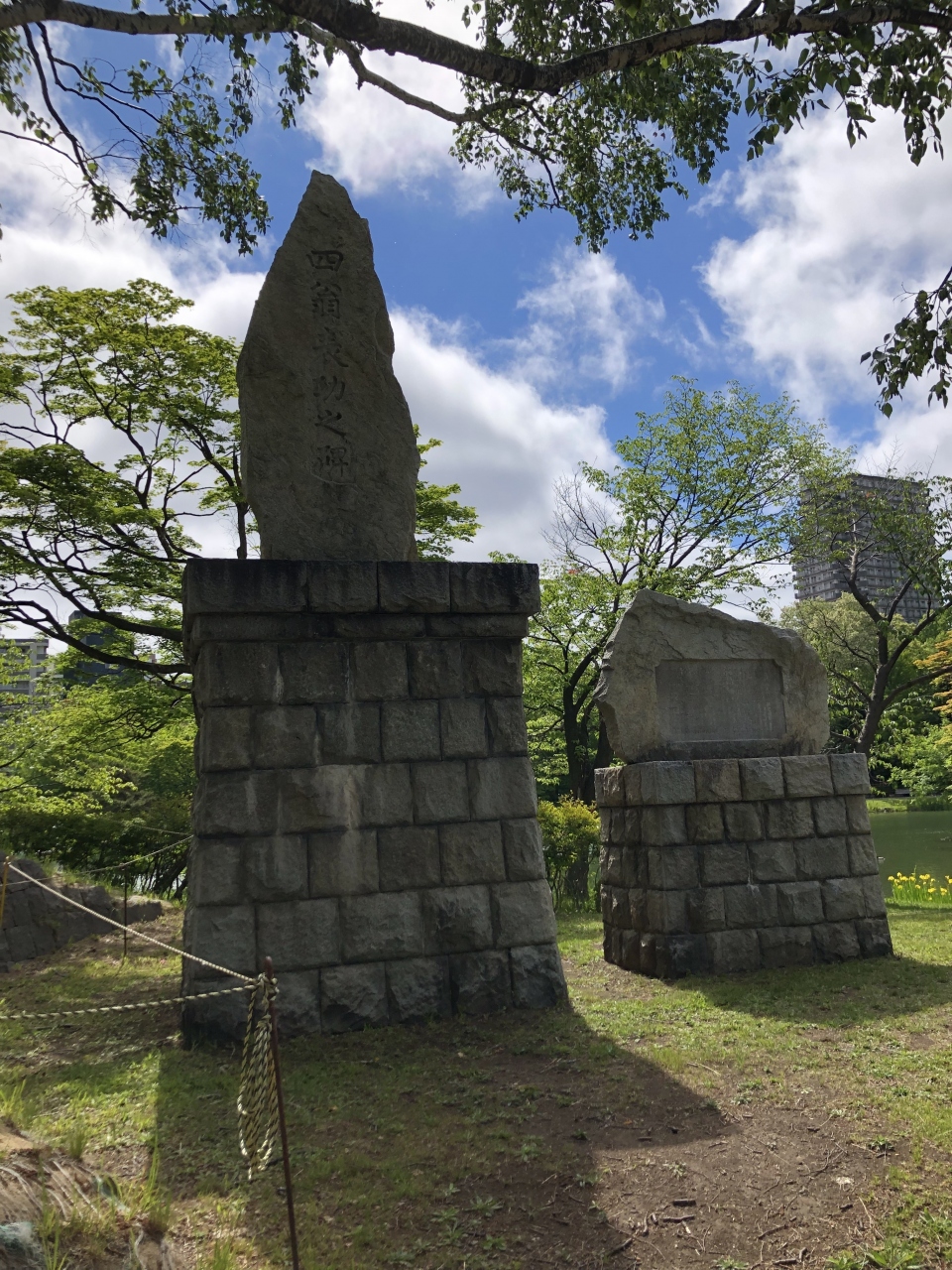 中島公園散策中に、菖蒲池前に設置されているのを見つけました。日本庭園の入口付近です。大小2つの碑が並んで設置されており、札幌の開拓に功績のあった4人を称える碑だそうです。裏面には説明が彫られています。大正時代に建てられたもので、中島公園にあるモニュメントの中では古いものであることがわかりました。
