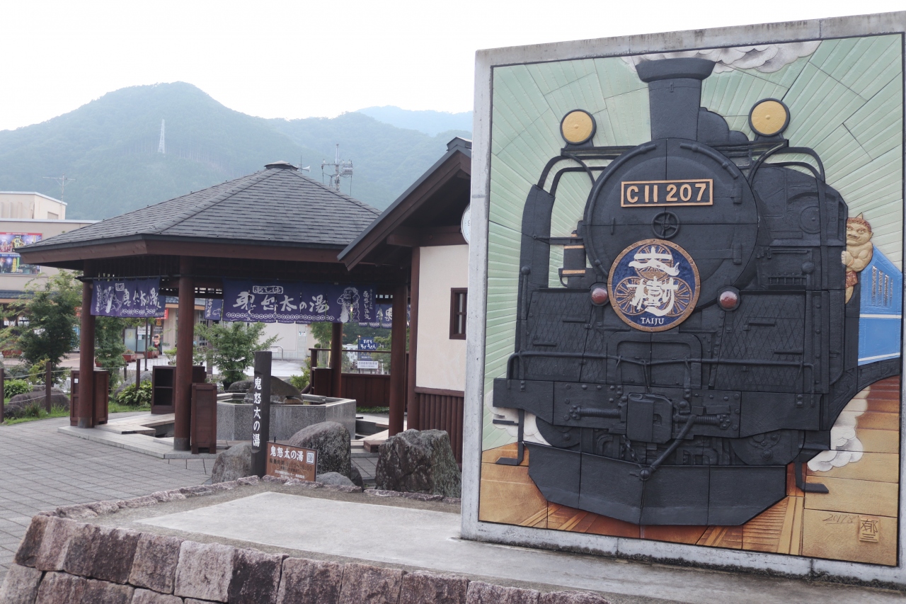 東武鬼怒川温泉駅前広場にある足湯手湯です。無料で温泉足湯が楽しめます。すぐ横にはSL大樹の大きなパネルも飾られています。鬼怒太とは鬼怒川温泉のキャラクターの鬼の名前で駅正面には鬼怒太の像も飾られてあります。