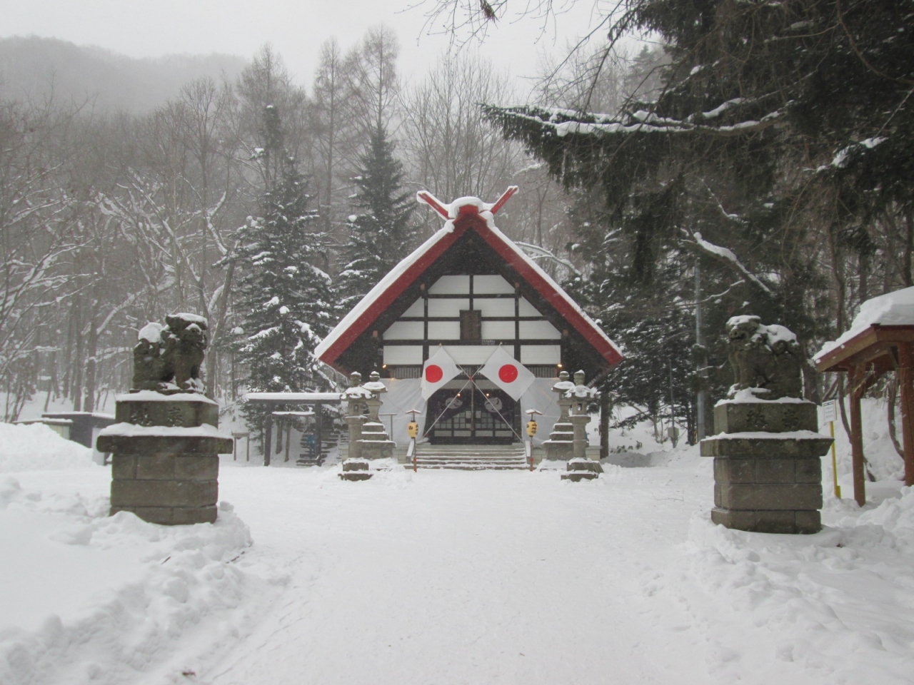 大雪の中社殿に続く参道はきれいに除雪されていましたが、参拝者はほとんどいないため、雪に囲まれた定山渓神社は静か過ぎるほどでした。