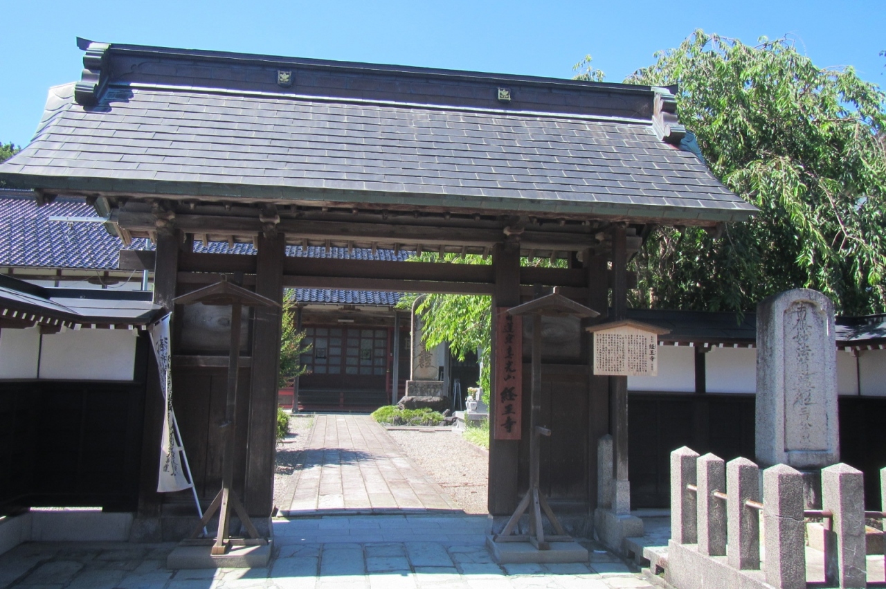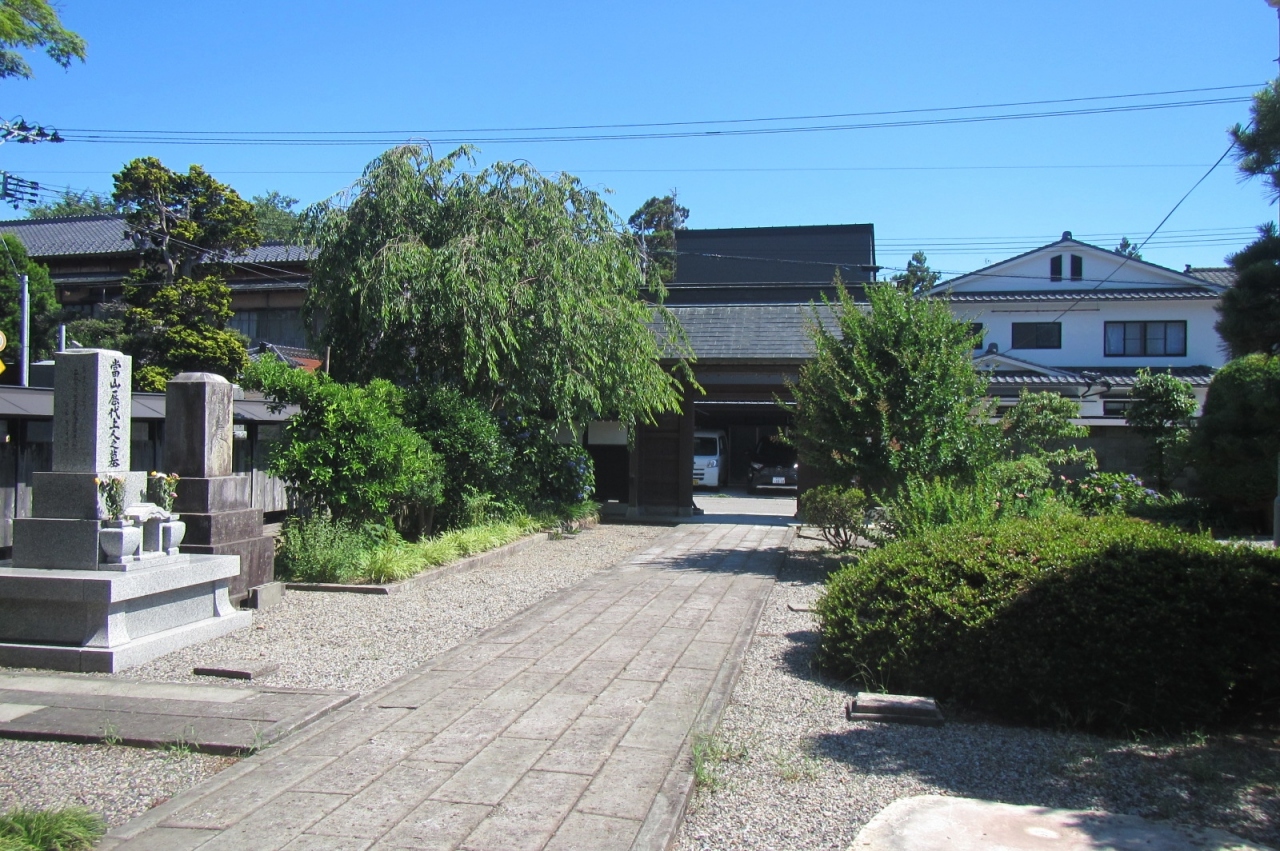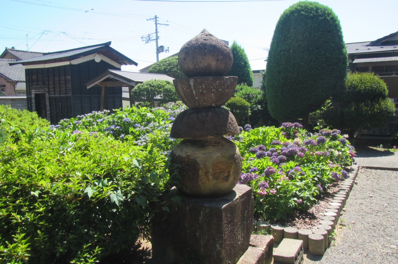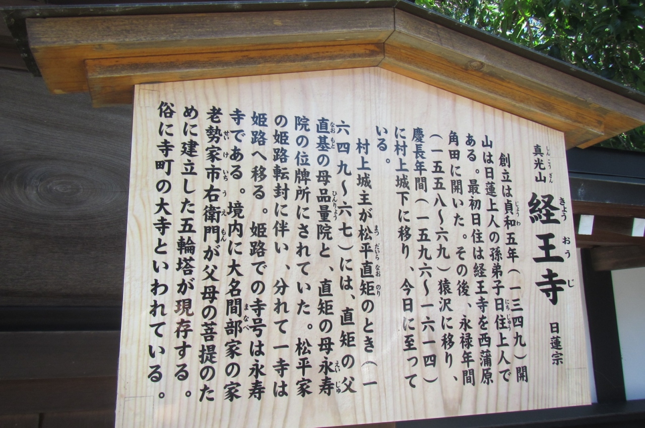 さまざまな宗派の寺院が立ち並ぶ寺町の一角にある日蓮宗のお寺で、入口の解説板によると、境内に間部家の家老が建てた五輪塔があるといいます。