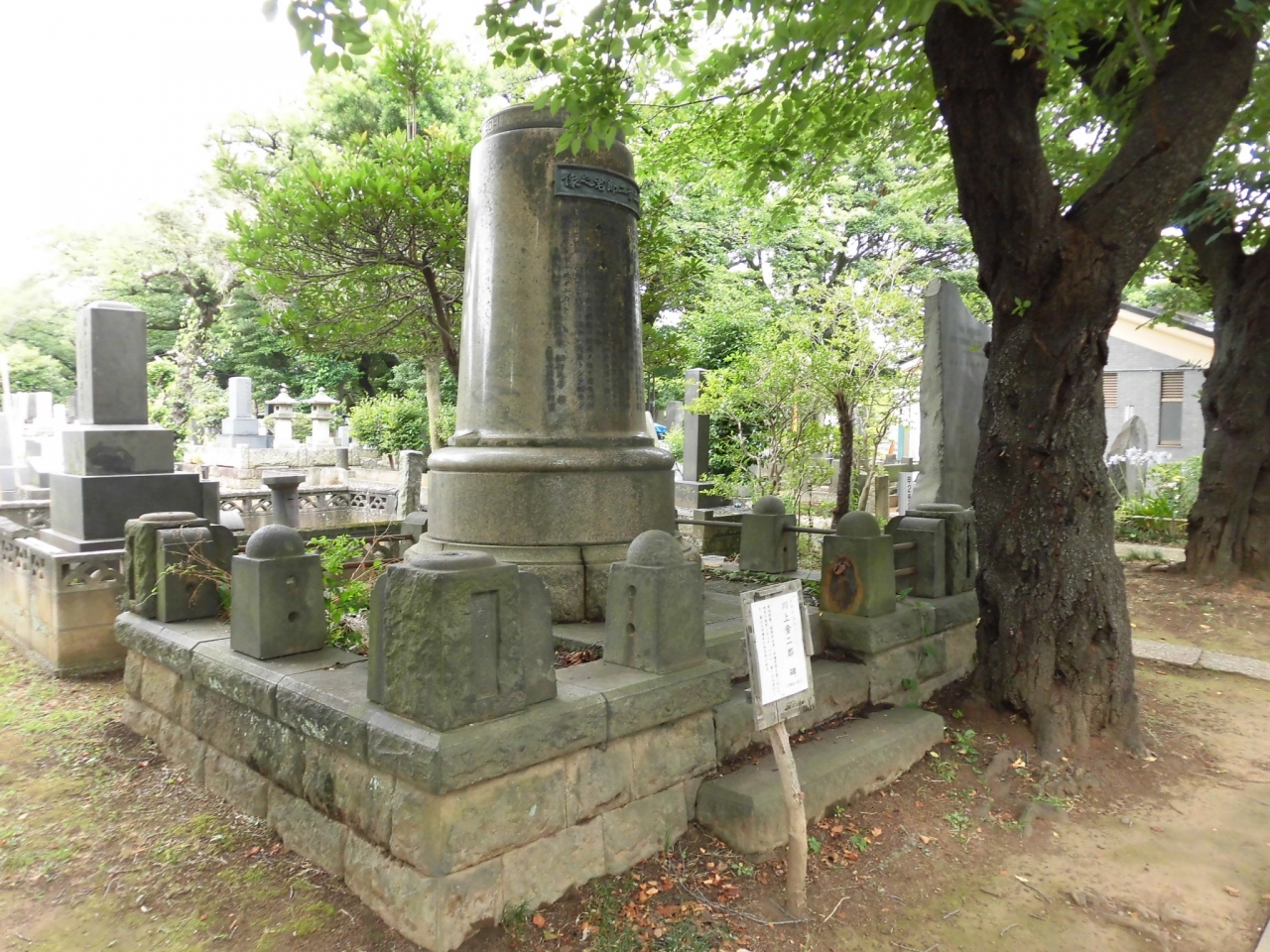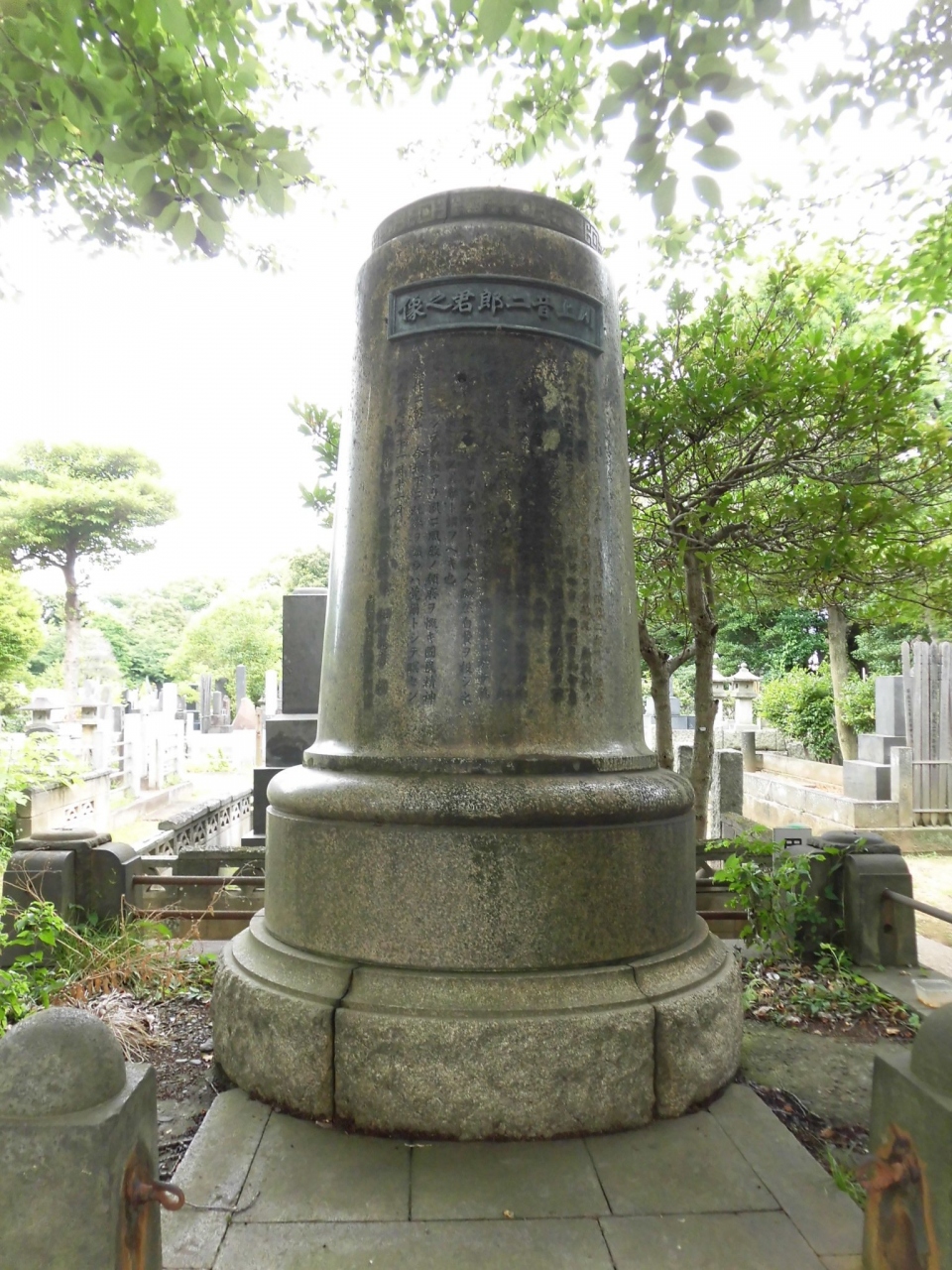 谷中霊園墓地の中を散策中に、円筒形の不思議なお墓があったので立ち寄ってみました。おっぺけぺ節で有名だった、川上音二郎のお墓でした。墓誌には川上音二郎君之像と刻まれているので、ひょっとしたら円筒形部分が台座で、その上に銅像があったのかもしれないとお思いました。