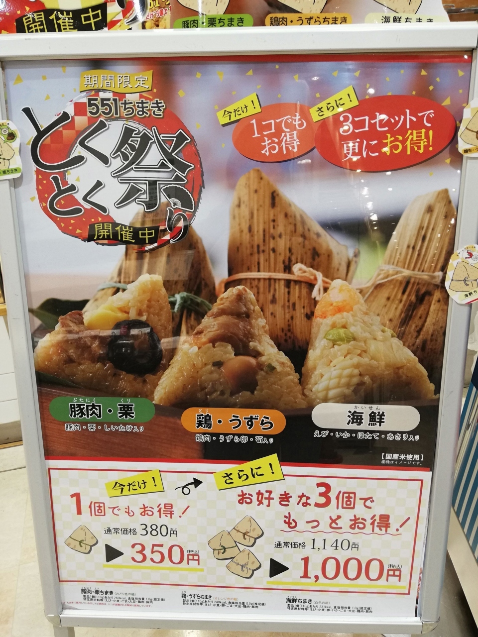 守口の京阪百貨店のデパ地下にあります。キャンペーンだったので、粽(ちまき)を買いました。3個で1,000円(税込)で、通常よりも150円ぐらい安く買えました。海鮮味、豚肉、鶏・うずら味など味は3種類で、全部おいしかったですが、個人的には豚肉味が一番好きです。