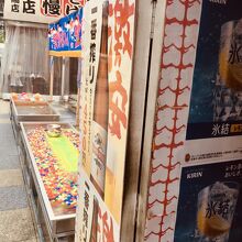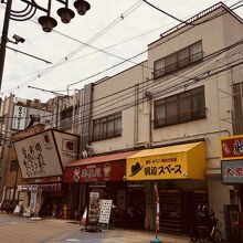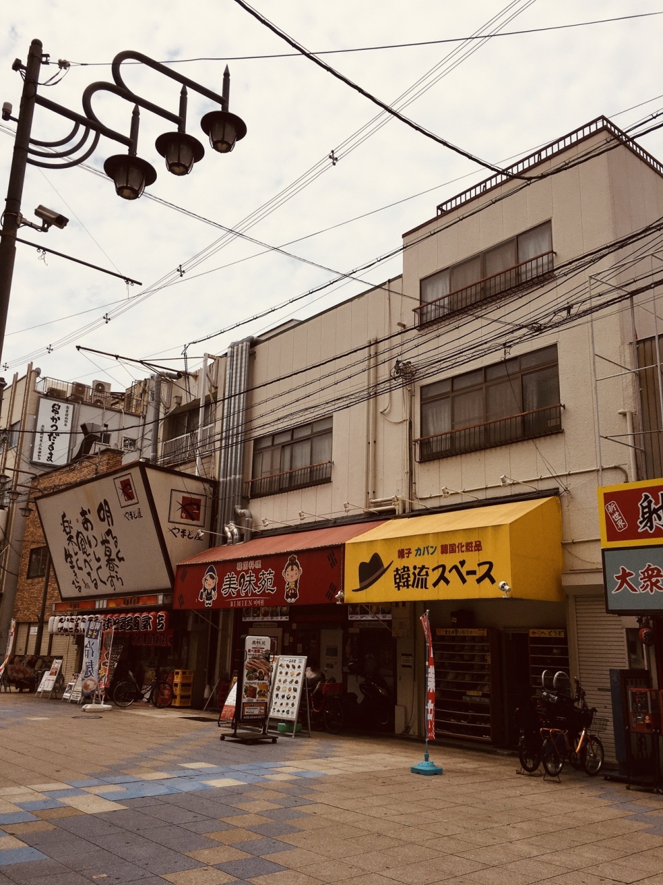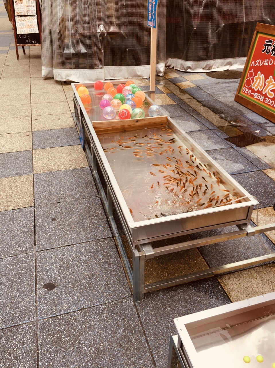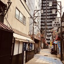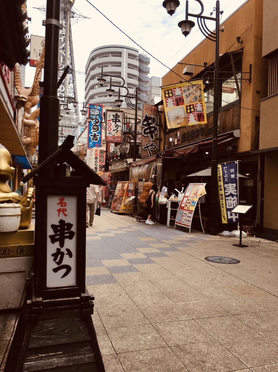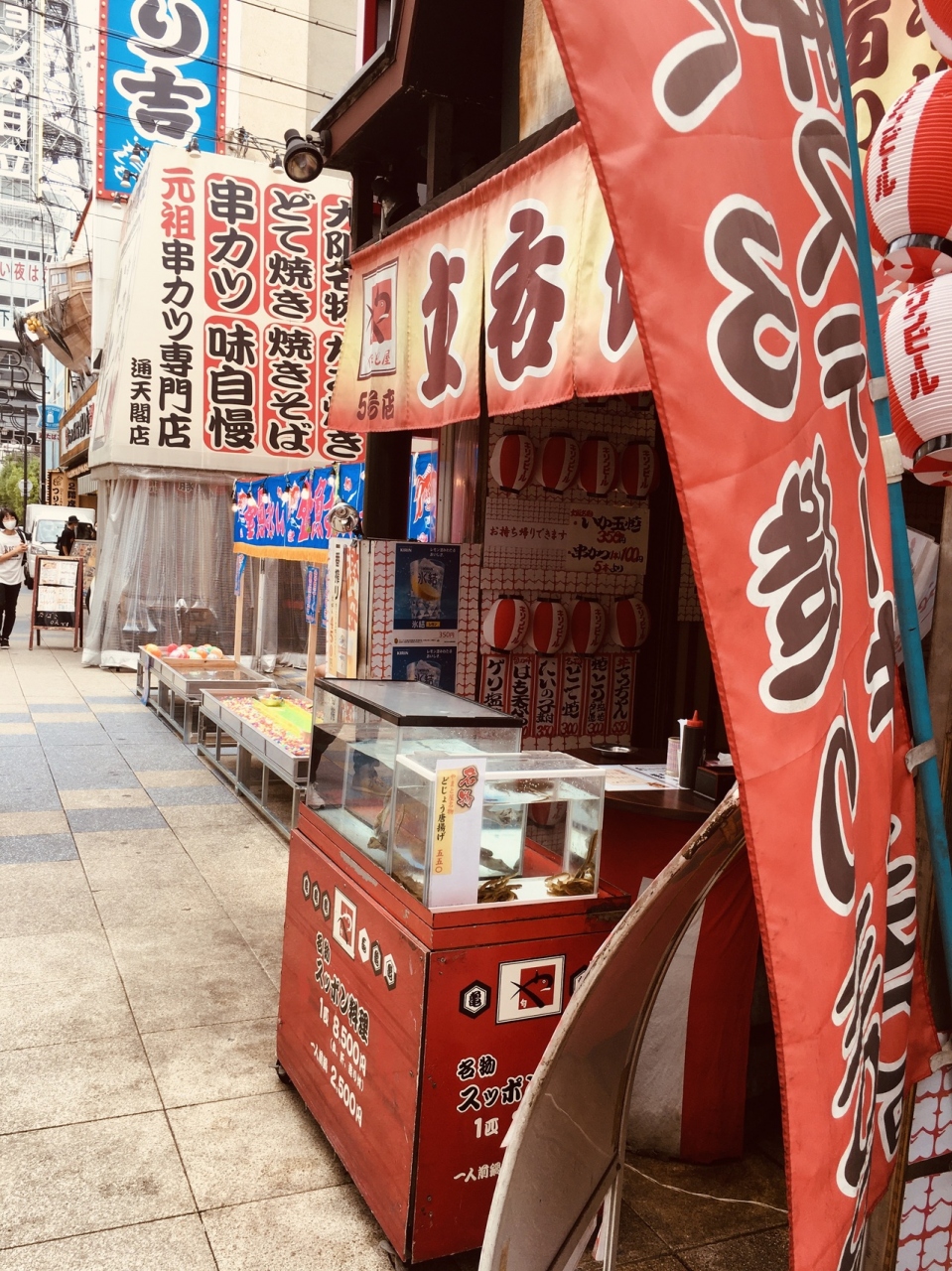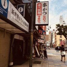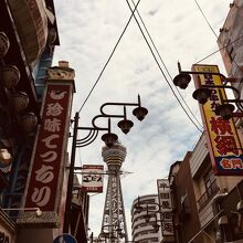 通天閣を中心に広がっているエリアで、串カツや一杯飲み屋も多く、派手な店構えが多かったです。古い佇まいの店も残っていて新旧の建物を見ることが出来ます。射的の店の他、金魚掬いの店もあり、テーマパーク的な街並みです。