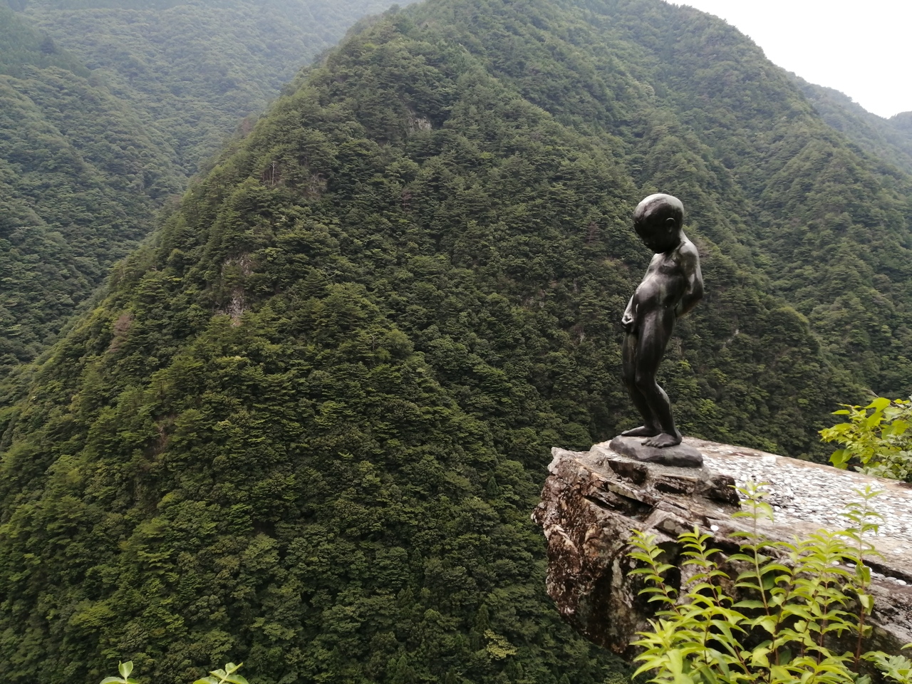 岨谷峡、大歩危に向かう途中にある有名なスポットです。くねくねと狭くてカーブの多い道なので、ほっと一休みするのにもよかったです。谷に向ってオシッコをする愛らしい姿に癒やされました。駐車場はなく、小便小僧のそばに数台停められるだけなので、観光シーズンだとゆっくり眺められないかもしれません。