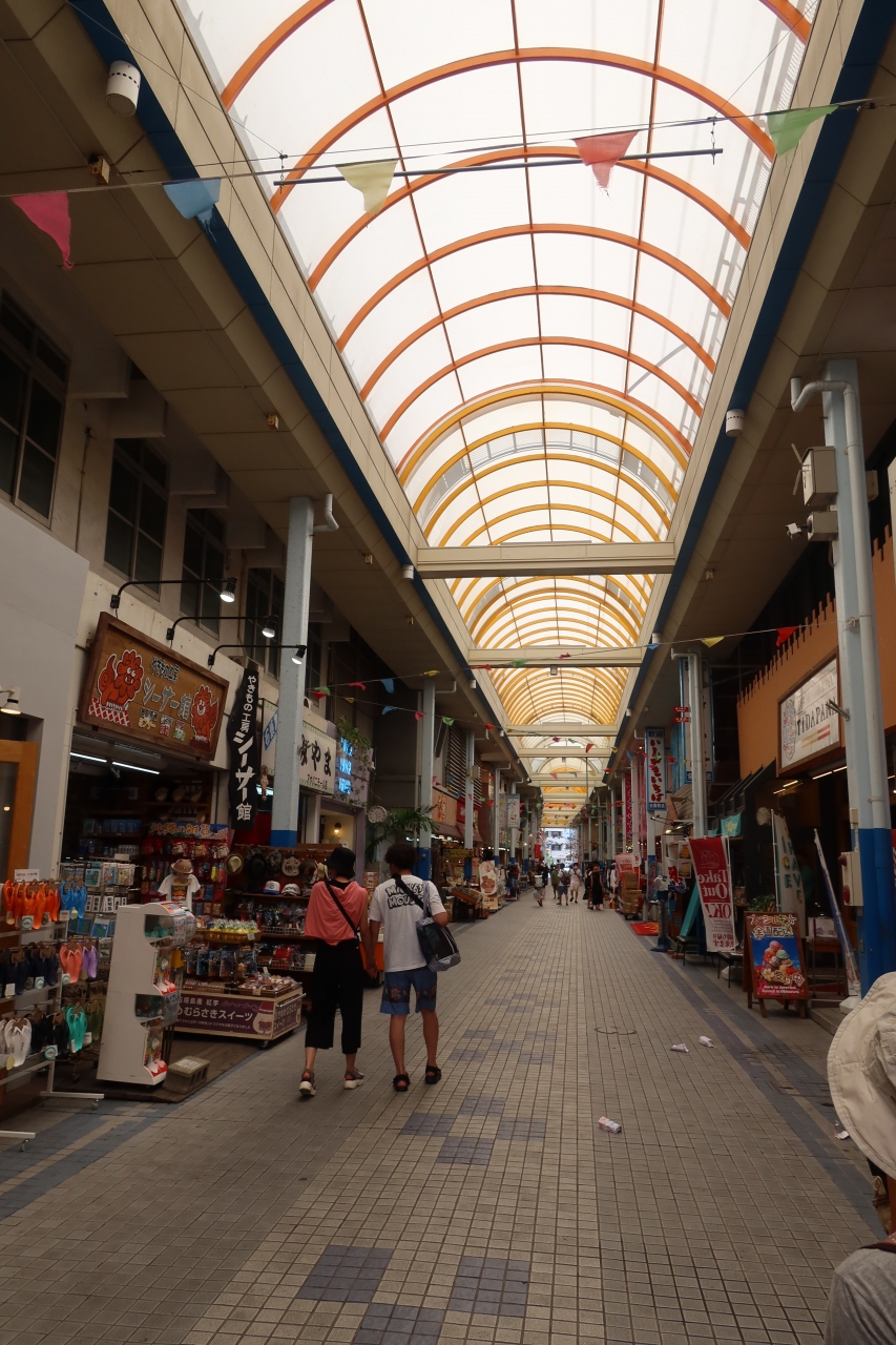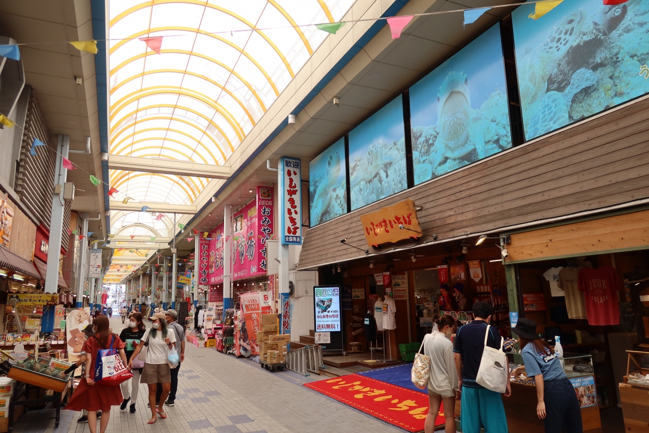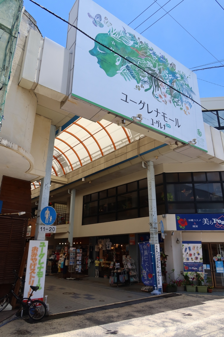 石垣島の730交差点から3分ほどの所にユーグレナモールがあります。2つの通りにある商店街でアーケード街となっています。石垣島随一の商店街で、お土産屋さん、飲食店が数多く並ぶ南国の雰囲気がする人気の観光ポイント。