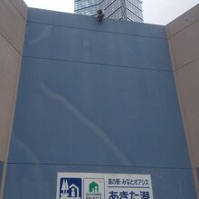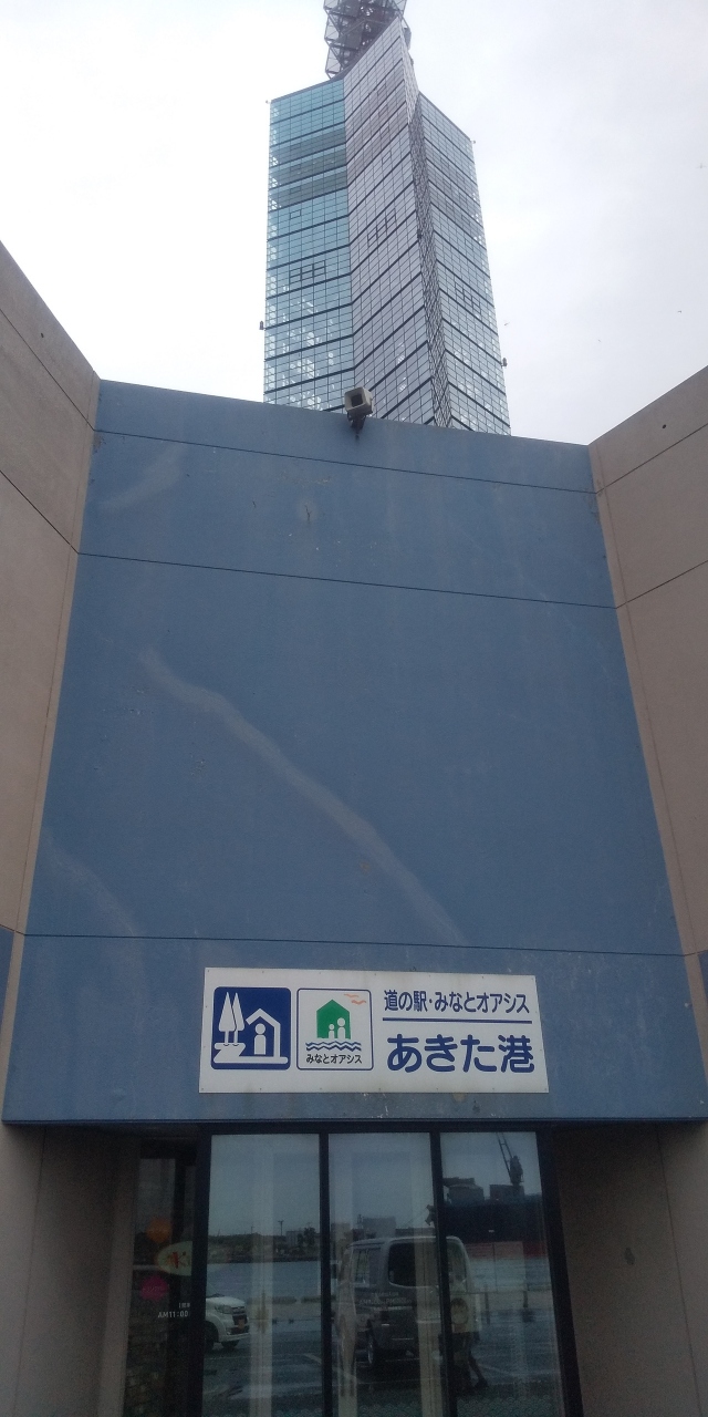 あきた港前にそびえるポートタワーと、観光物産館セリオン。