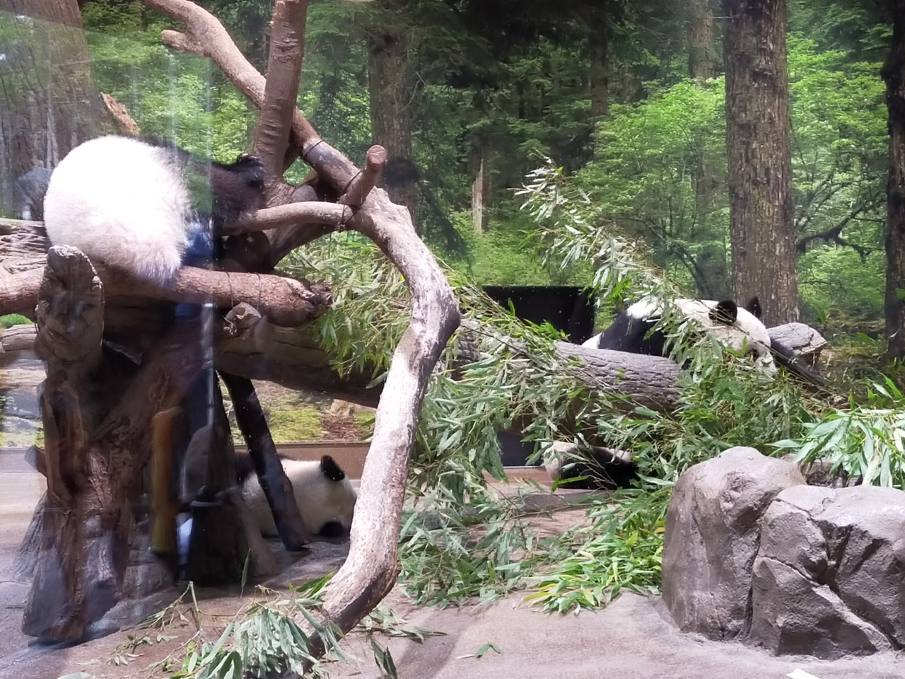 抽選に当たったので、パンダ親子を見に行きました。入口から見る迄にQRコードを3回を見せ、10人毎のグループに分けられ、いざパンタの前に行くと、係員が1分間のタイマーをセットし、写真タイム。あっと言う間にアラームが鳴り、1分間の写真タイム中、パンダは寝ていました。