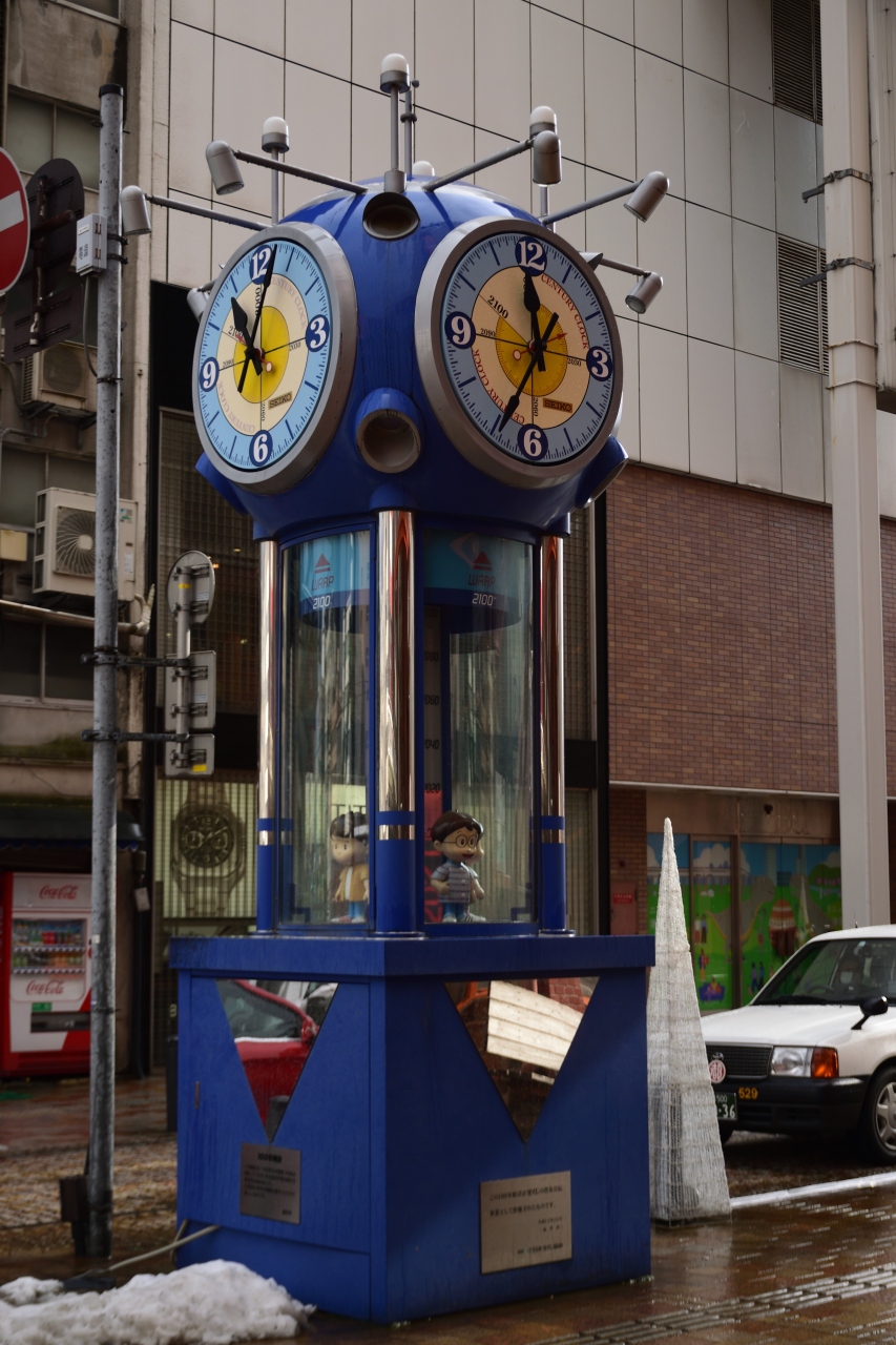 福井駅から徒歩圏内のアーケード街、西武の近くにあるからくり時計です。高さ5メートル近くあり、青色の目立つ存在です。普通の時計の長針、短針に加えて年針も設置されているユニークなからくり時計です。思わず見入ってしまう存在です。