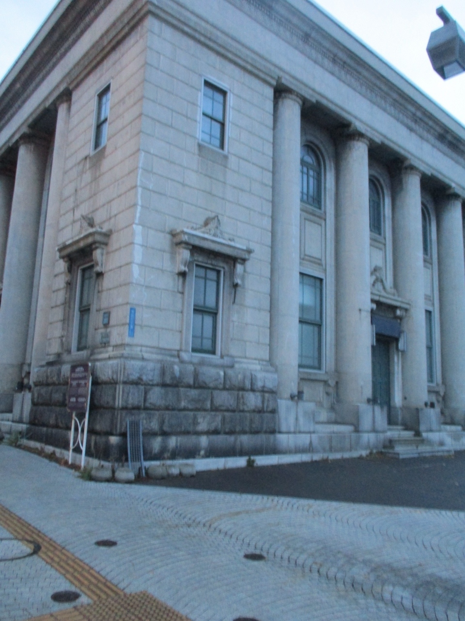 中央通りに面してたっています。昭和初期に建てられた鉄筋コンクリートの重厚な建物で、ギリシャ風の重量感のある円柱が特徴的です。富士銀行のあと、新聞社の建物として利用され、現在は、小樽市歴史的建造物に指定されています。