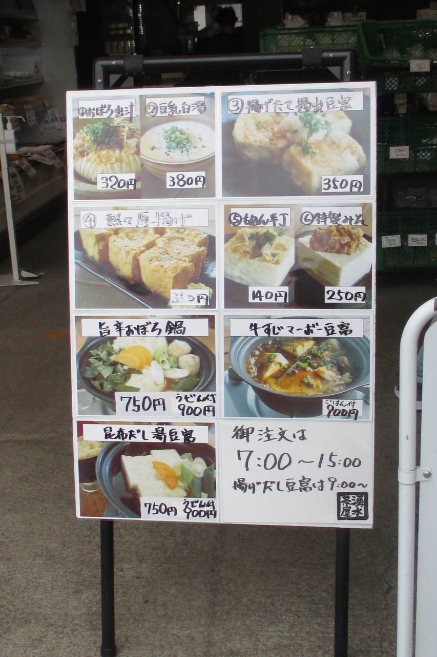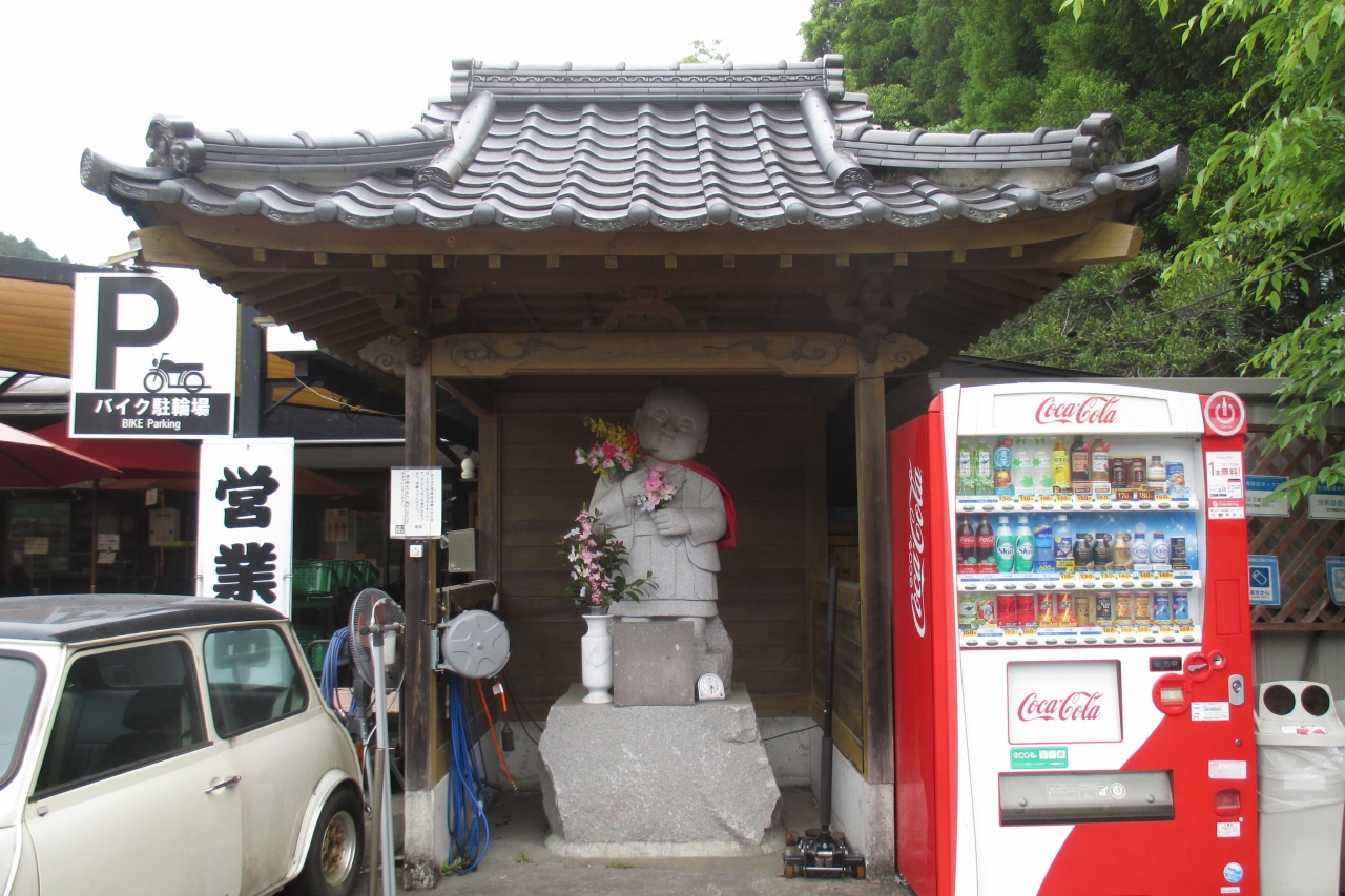 おづる水の駅を訪れる人で、水汲みに来た人以外はこちらのお豆富がお目当て?と思えるほど人が集まっていました。店先には本日の大豆は豊後大野、本日の米は直入町おづる産と書かれていました。また、テーブルには豆富専用かけ醤油と厚揚げ・揚げ出し専用醤油が置かれていました。いろいろと拘りのあるお店でした。最近の道の駅などでは生産者の名前を記載して売っていることが多くなってきましたから、その内、今日の大豆は豊後大野の○○さん生産となるのでしょうね。余談ですが、お店の隣に大きなお地蔵さんが祀られていました。現代風のお顔立ちをしていましたが、お地蔵さんの名前など特に案内は見当たりませんでした。