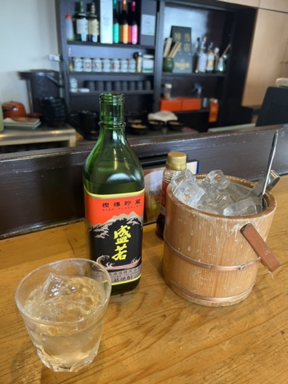 先ずは生ビール!つまみに早く出せると言うので蟹味噌ポテトサラダを。そして明日葉天ぷら!そして神津島の麦焼酎盛若はボトルで。