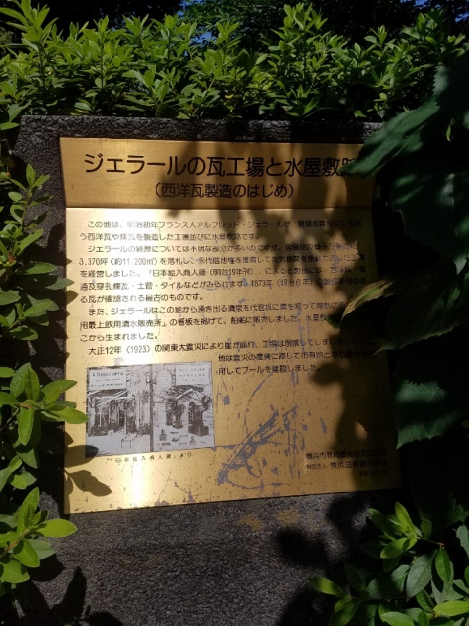 高低差のある元町公園の下側に説明板がありました。フランス人のジェラールさんがこの辺りでフランス瓦を製造していたとのこと。山手の西洋館群にも使われていたのでしょう。またこの辺りに湧き出る水を溜めて売っていたので水屋敷と言われたそうです。今はプールになっているのが名残でしょうか。ジェラール瓦は山手80番館遺跡の壁にきれいに展示されているので見てみてください。