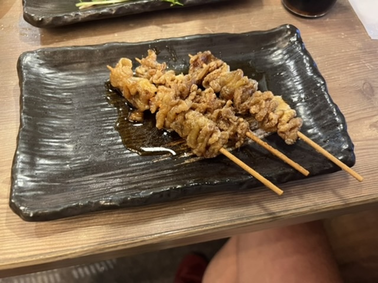 飲み放題にして先ずは生ビール!つまみはとり皮串と鶏唐揚げ薬味ポン酢で。