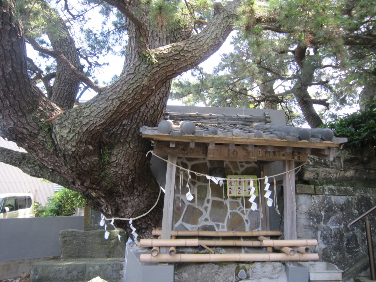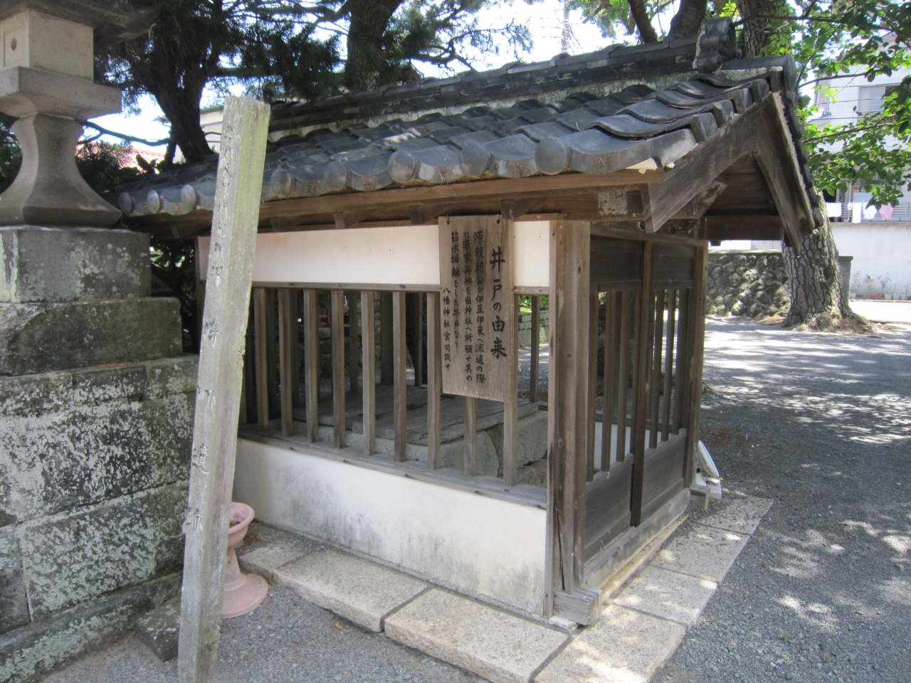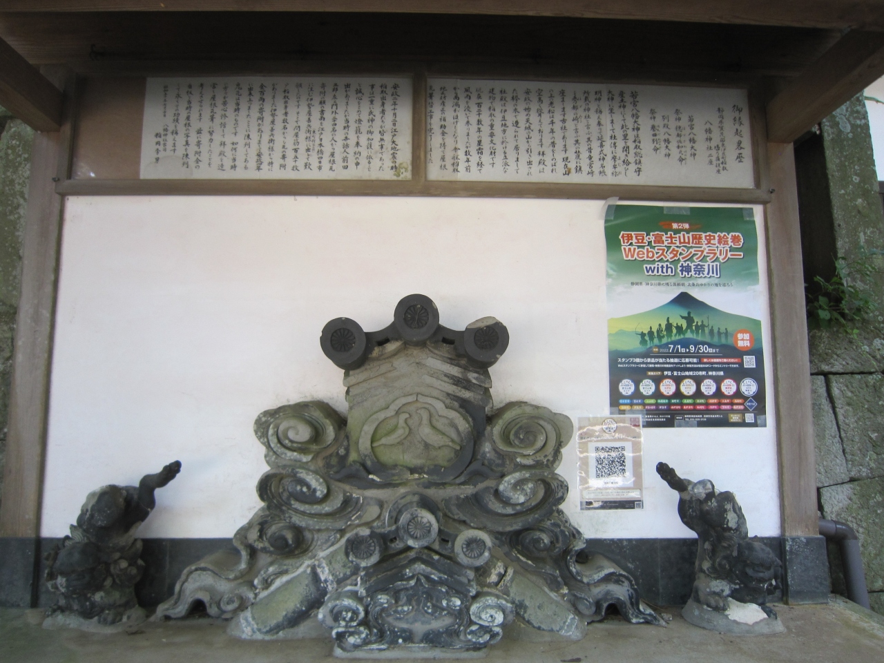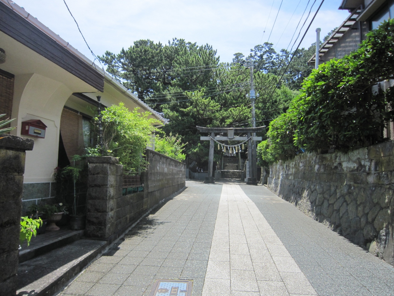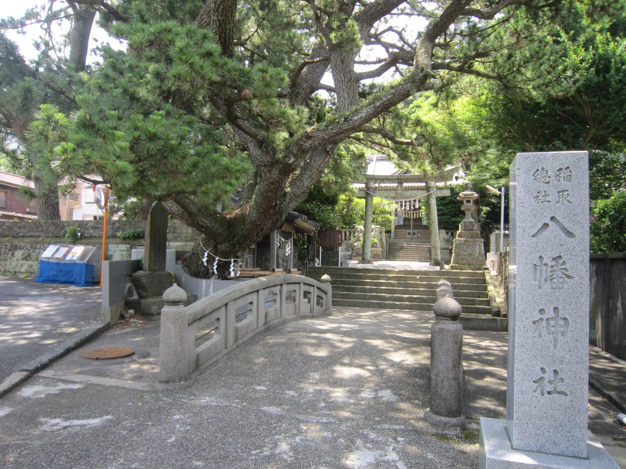 稲取漁港から街の中へ、住宅街の中にあります。伊豆稲取駅から遠くはありませんが分かりにくいかも知れません。神社へ続く道路は綺麗に整備されています。稲取の総鎮守社として崇敬されているそうです。神社正面の石橋太鼓橋を渡り左側に手水舎と立派な松の木、境内は多くの樹木に囲まれています。石の鳥居をくぐると先に拝殿が見えます。鳥居脇の八幡神社の謂によると神社の創建は不明ですが、弥生時代の遺物が出土、平安時代末より源氏との縁が深く源頼朝が参拝のため身を清めた井戸がある、忠魂碑の土台や石の鳥居は稲取の石で作られている等々説明がありました。この説明板により境内を見て回りました。拝殿も古そうです。拝殿正面上には立派な彫刻が施され、拝殿前の狛犬は目や口を赤くしており何か意味があるのでしょうか。また、屋根瓦を陳列し神社の略歴等を掲示、拝殿の造営、維持管理には苦労しているとありました。地元の人々の努力により成り立っている神社のようです。