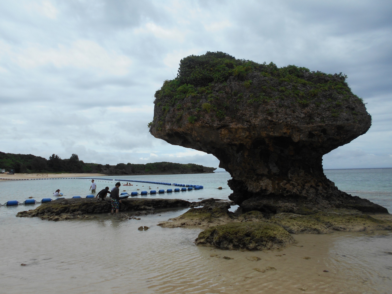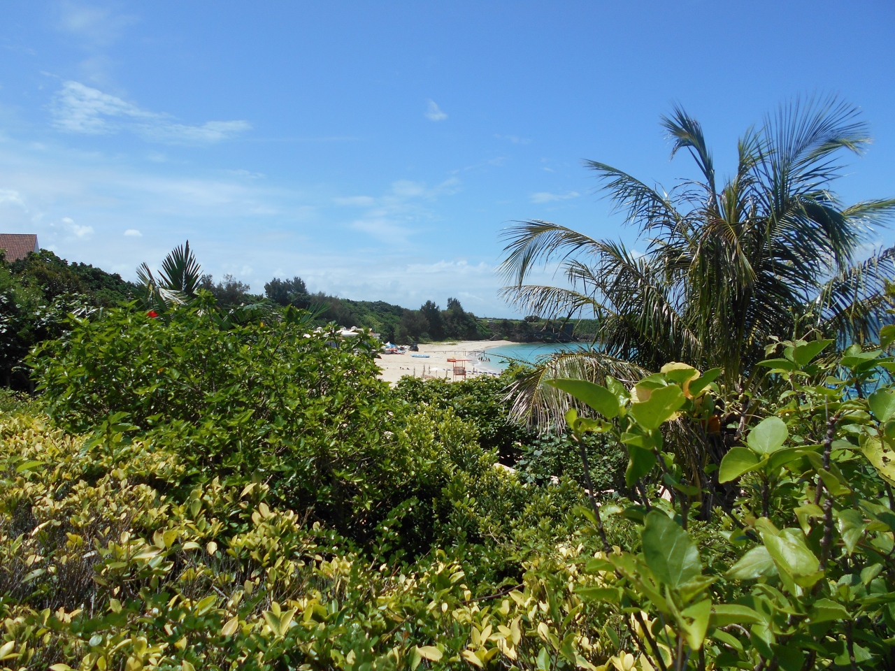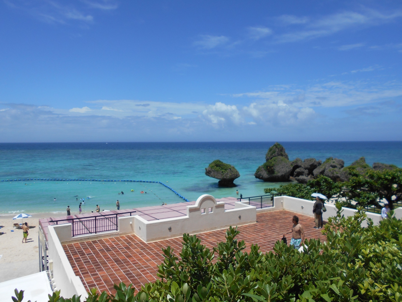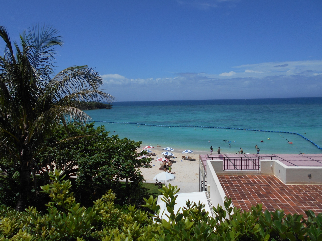 ホテル日航アリビラの目の前に広がる自然そのままのプライベートビーチ。遊泳区域外の浜近くに岩場があり、朝の散歩でヤドカリや熱帯魚が透明な海に泳いでいるのが見つけられます。孫たちは大喜びです。岩場の先でシュノーケリングを楽しんでいるカップルがいました。水平線が見渡せる程で、夕日が海に綺麗に沈むそうです。開放的なビーチです。