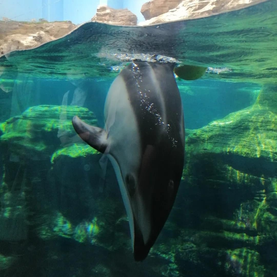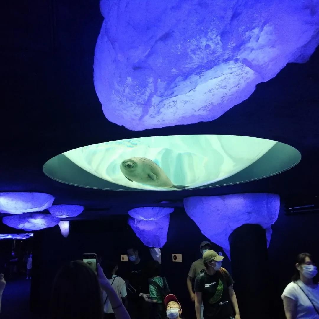 階層をまたがっている、大水槽に泳ぐジンベイザメも迫力がありよかったが、おもしろいのが天井を見上げてある水槽からこちらを覗き込んでいた、笑い顔アザラシです。