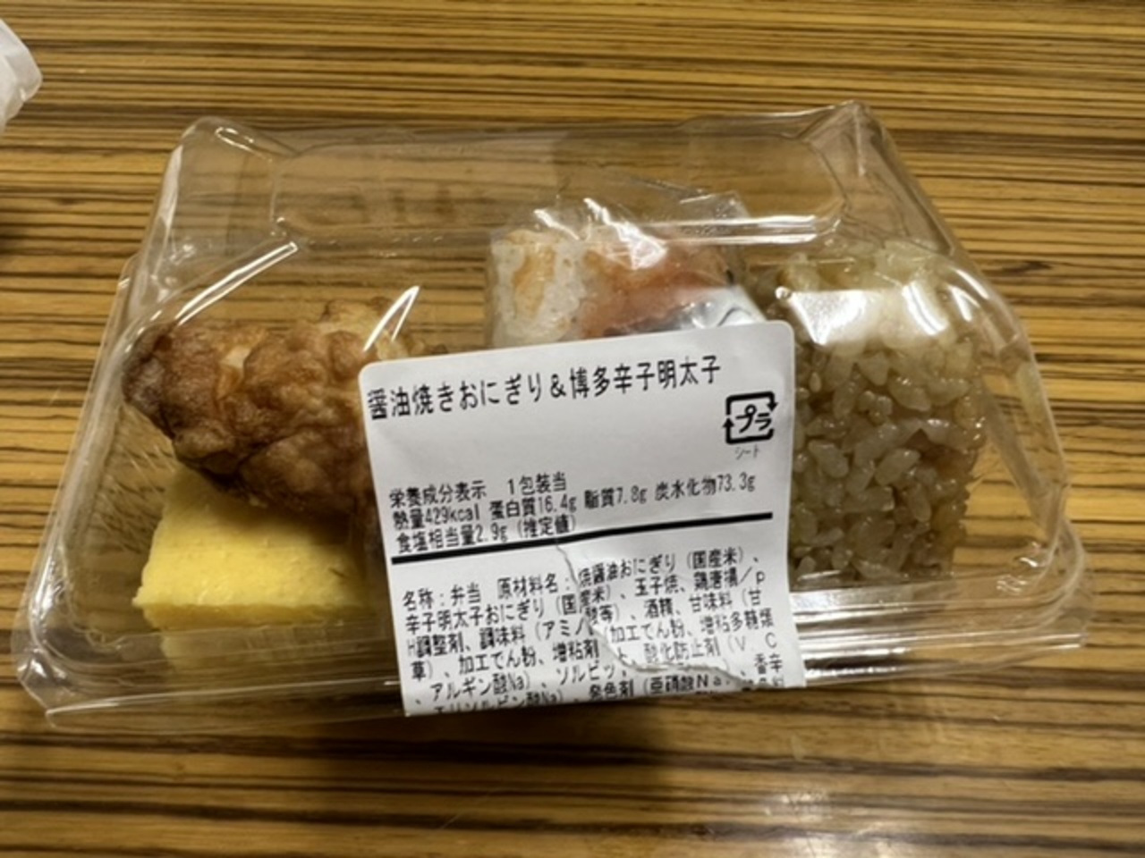 買ったのは醤油焼きおにぎり&博多辛子明太子おにぎり弁当610円!鶏唐揚げと玉子焼きが付いてますよ。シンプルでいい。
