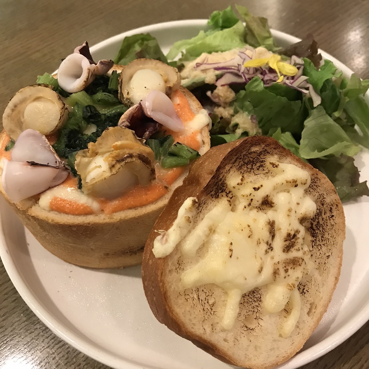 大きめのフランスパンを丸太にのように立てて、中身を少しくり抜き、ホタテとイカ,野沢菜の明太クリームソースを入れたもの。ソースはパスタなしのグラタン、といったところで味は濃いめ。パンの量が多いのでバランスには困らない。まるで蓋にするかのように同じパンのチーズトーストも添えられてある。こちらは若干焼き過ぎで焦げていたが。サラダのドレッシングもおいしかった。ランチタイムだとドリンクが無料とのこと。