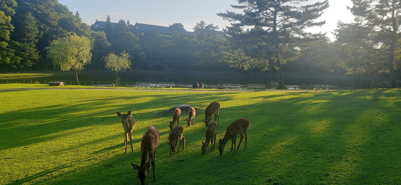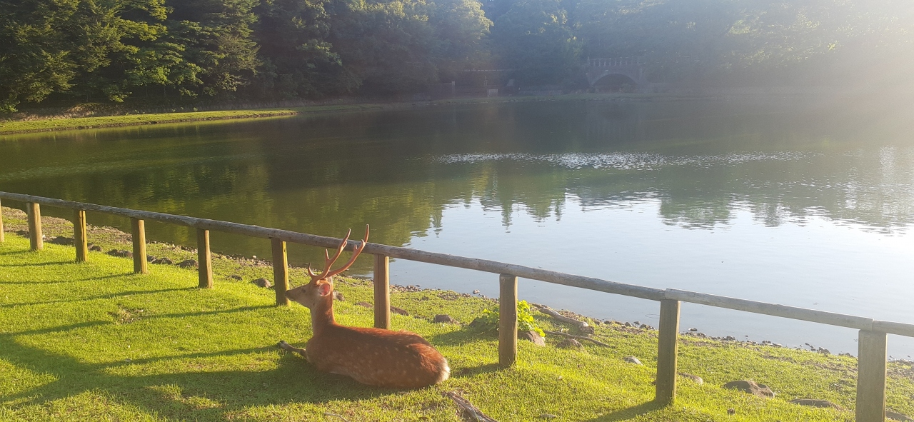 池の周りは芝生の園地になっており、奈良の鹿もいました。
