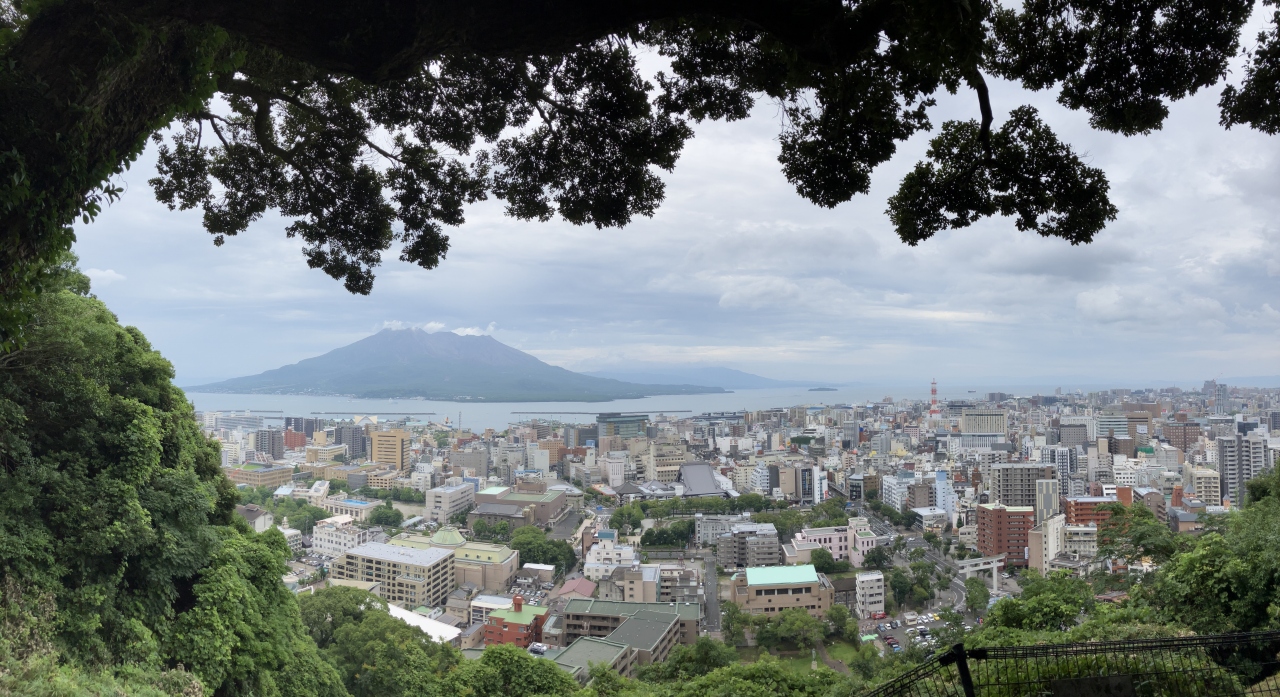 桜島を見るスポットとして一番良いのが此処です。駐車場が有るので車を停めてゆるい坂を歩いて行くと、展望台に到着です。丁度眼下に照国神社とその鳥居が見え遠くには桜島が見えました。ボランティアガイドさんが外国からの観光客に声をかけていましたよ。