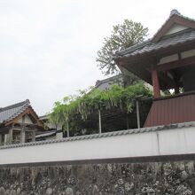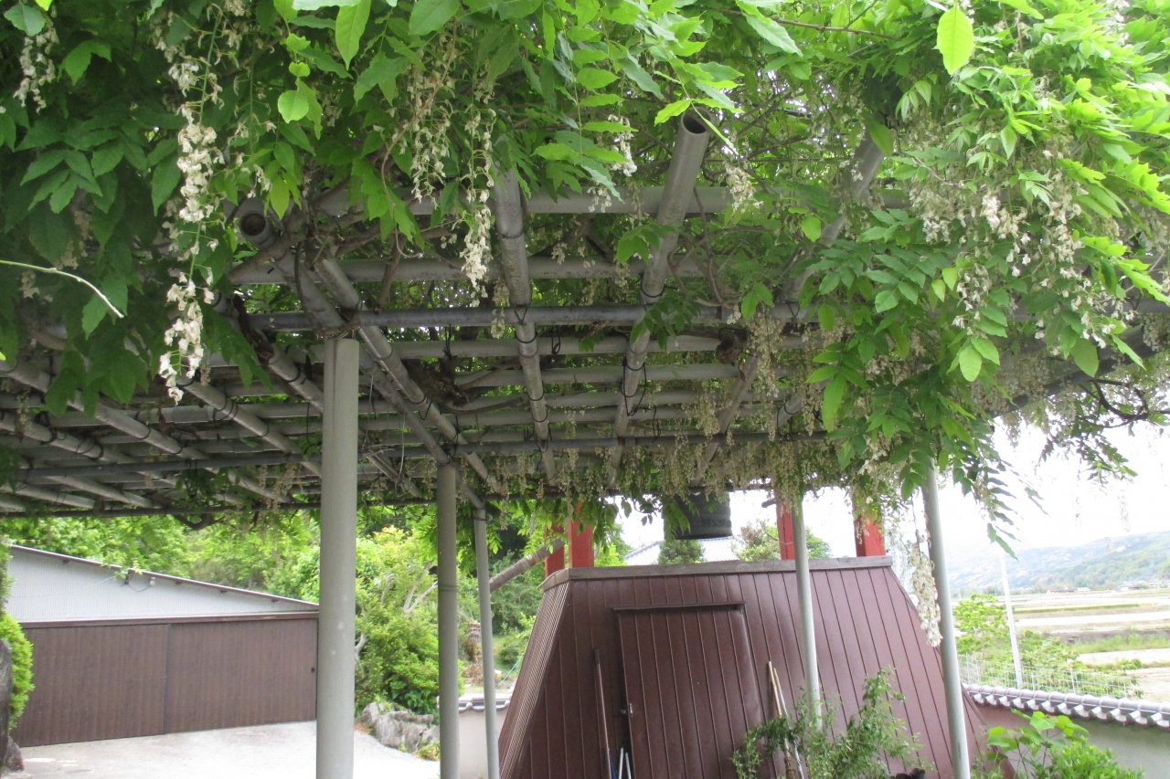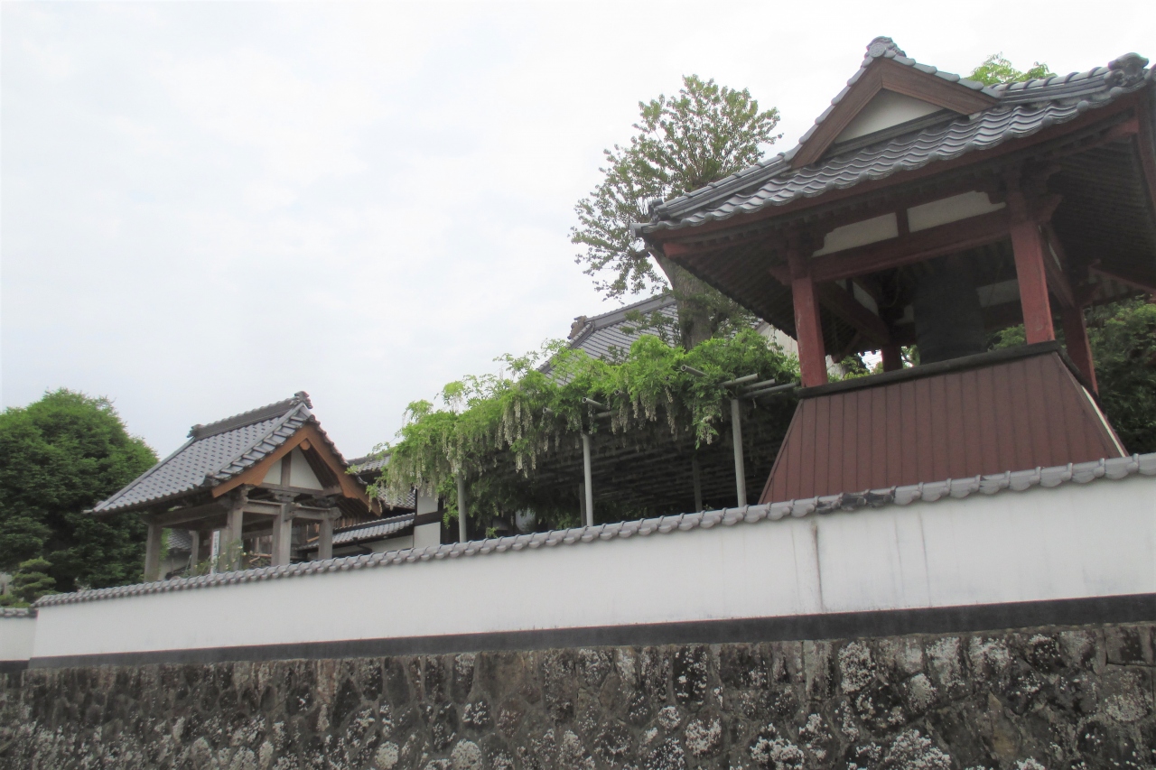 三光寺は豊後高田市の香々地公民館から程近いところにありました。山裾を通る道路に面していて、石垣風の土台の上に白壁の築かれた小綺麗なところでした。境内に藤棚がありました。藤色という言葉がある様に、藤というと紫色の花をイメージしますが、このお寺さんの藤は白い花を付けていました。白い藤の花も清楚な感じがして、お寺さんにはぴったりだと思いました。