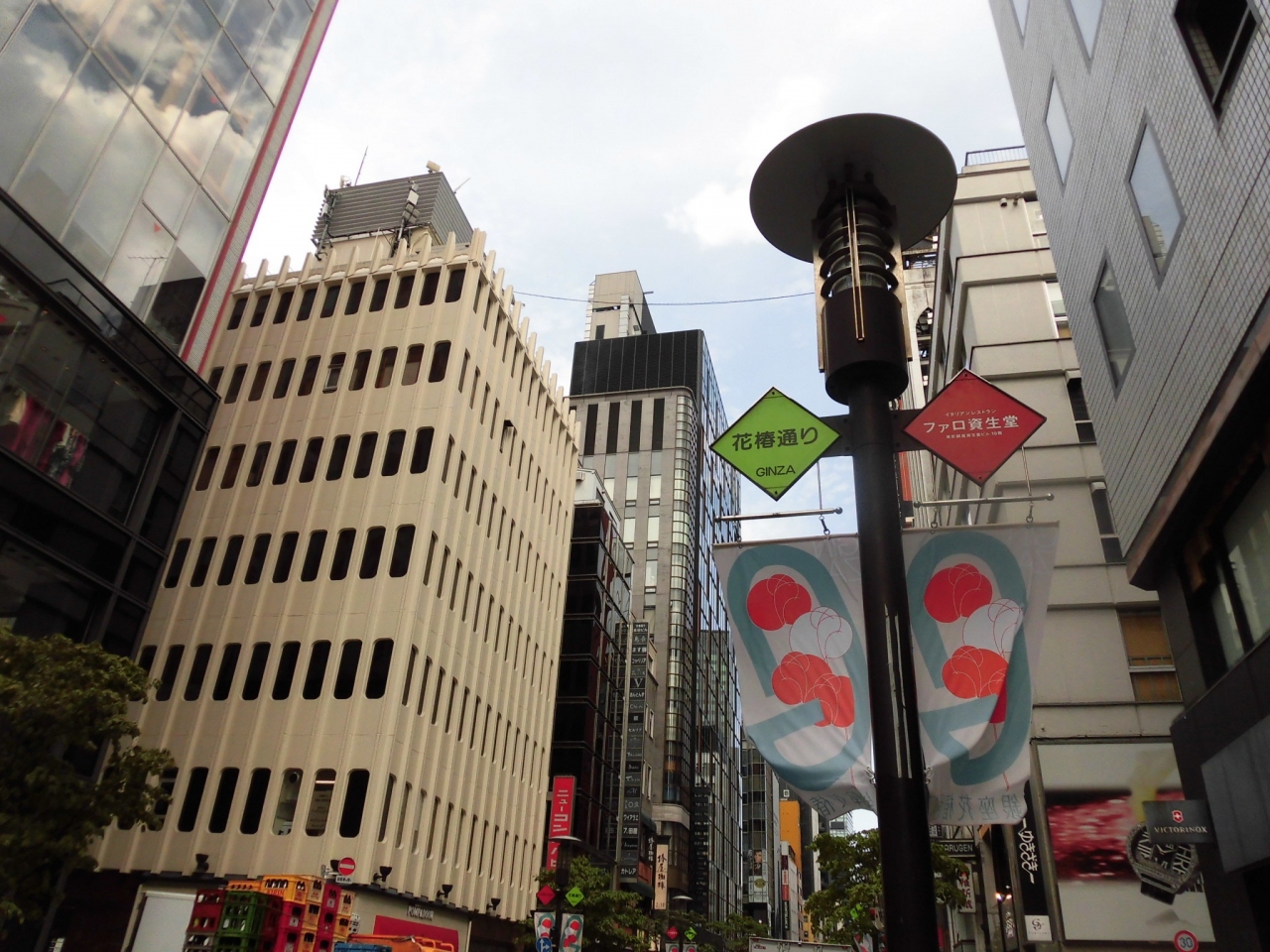 銀座7丁目近辺を散策中に、通りの名前が花椿通りと書かれているのに気が付きました。確かにこの通り沿いに、化粧品大手の資生堂の建物があったので、なるほどとうなずけました。銀座らしいファッションセンスにあふれたお店もあって、素敵な通りだと思いました。