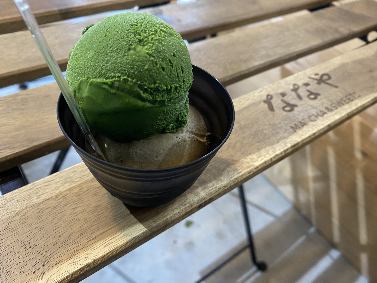 賑わう商店街の中に位置する人気のお茶屋さんです。休日の暑い日に行ったので5.6名ほど並んでいました。一番人気だという世界で一番濃い抹茶のジェラートとほうじ茶のジェラートをダブルで選びました。店内に食べる場所もあるのですが混み合っていたので軒先の椅子でいただいたので少々落ち着きませんでしたが、美味しかったです。