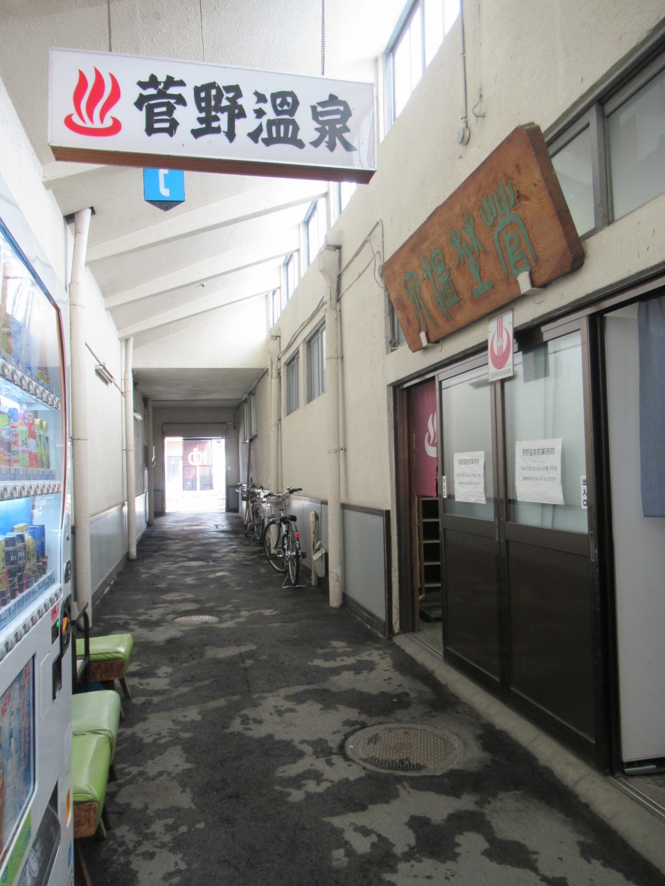 諏訪大社下社へ向かう大社通りにある交差点大社通りのそばに菅野温泉入口があります。アーケードの様な狭い通路の真ん中に温泉の靴脱ぎ場と番台があります。下諏訪観光案内所のスタッフが昭和レトロな面白い温泉ですよと薦めてくれた通り、円形の湯船と懐かしい雰囲気の温泉でした。地元の人が週末昼に来て汗を流していました。5時半からやっています。通路にはかつて露店が建ち並んでいたそうです。大社通りの旅館や店が閉店して寂しくなっているなか、昔の雰囲気を保っている温泉です。