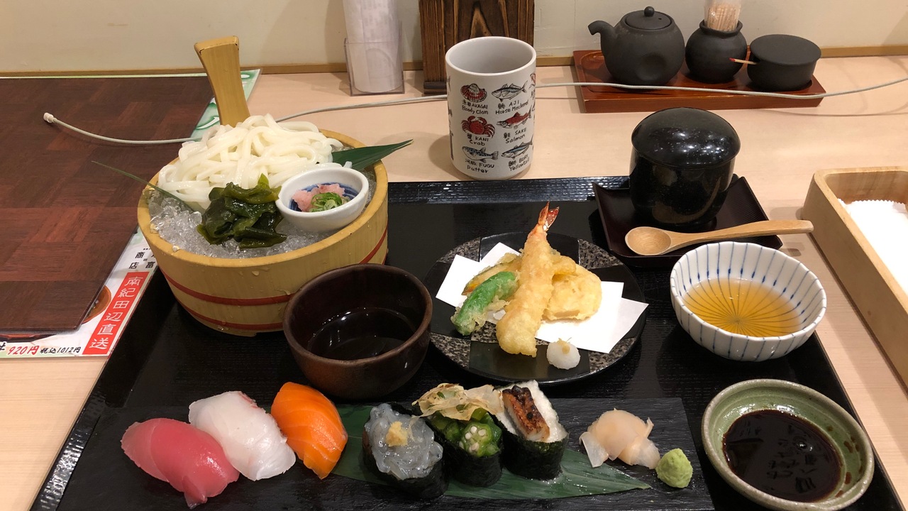 南海和歌山市駅ビル・キーノ和歌山1Fのレストランです。和歌山らしく、海鮮メニューが充実しています。昼膳を食べました。寿司6貫・天ぷら・南高梅おろしの冷うどん・茶碗蒸しで1400円ほどでした。LINEの特典&ネットクーポンで、ジュース・シャーベットをサービスしていただきました。