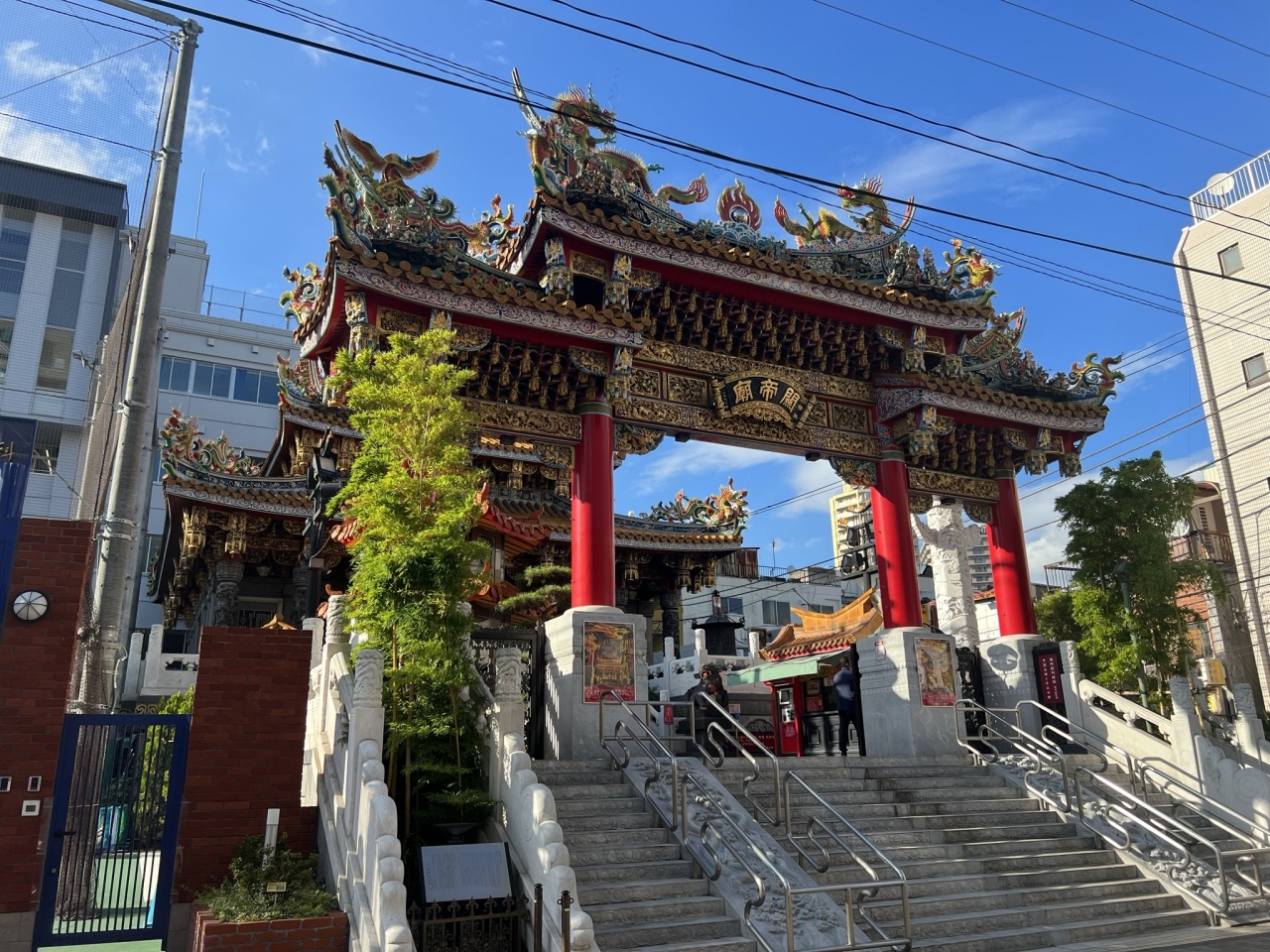 JR石川町駅から歩いて8分、地久門をくぐってすぐの所にある中国様式の仏教寺院で、色鮮やかで精緻な装飾をされた門やお堂が目をひきます。三国志の英雄として知られる武人の関羽(関帝)がご神体として祀られています。関羽は理財にも詳しかったため、金儲けや商売繁盛の神として信仰されています。