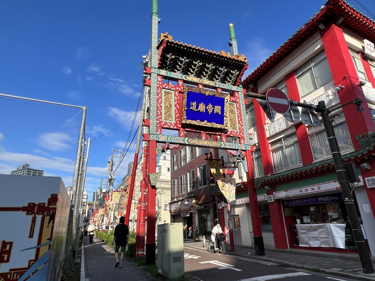 JR石川町駅から歩いて6分のところ、横浜中華街の入口に地久門があります。門の上には、石川町駅側には「関帝廟道」、反対側(中華街側)には「地久門」と書かれています。横浜中華街を東西に貫く関帝廟通りの西の端に位置しています。