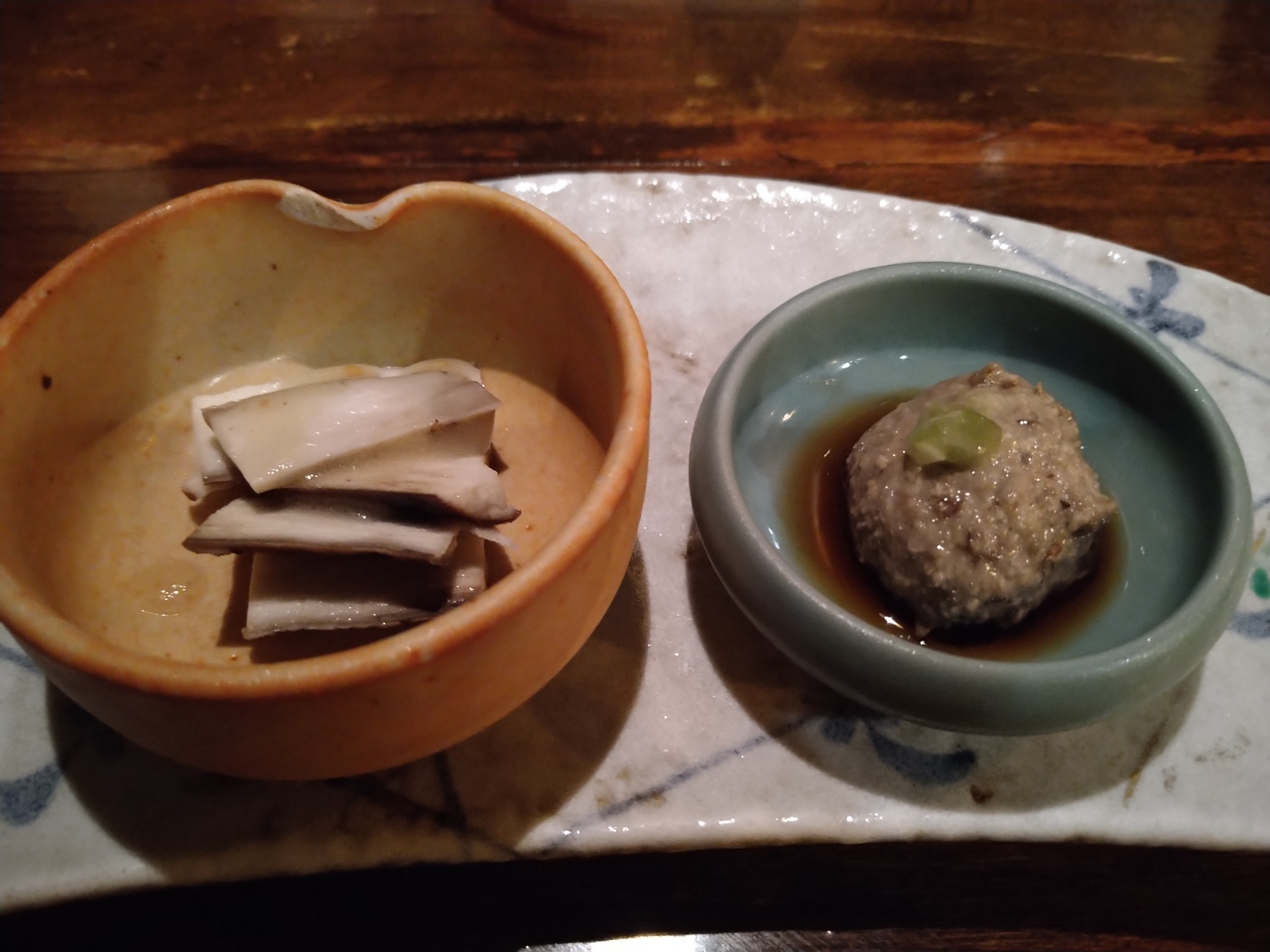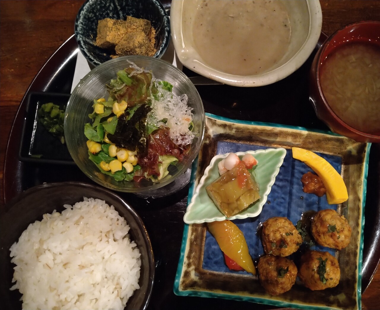 自然薯のランチ御膳。けっこうお腹いっぱいになります。自然薯の生とろろとお造り、とろろがけ麦ご飯。メインは唐揚げか、つくねを選べます。大根汁も美味しいです。ランチはすぐ満席になるので予約したほうが良いです。