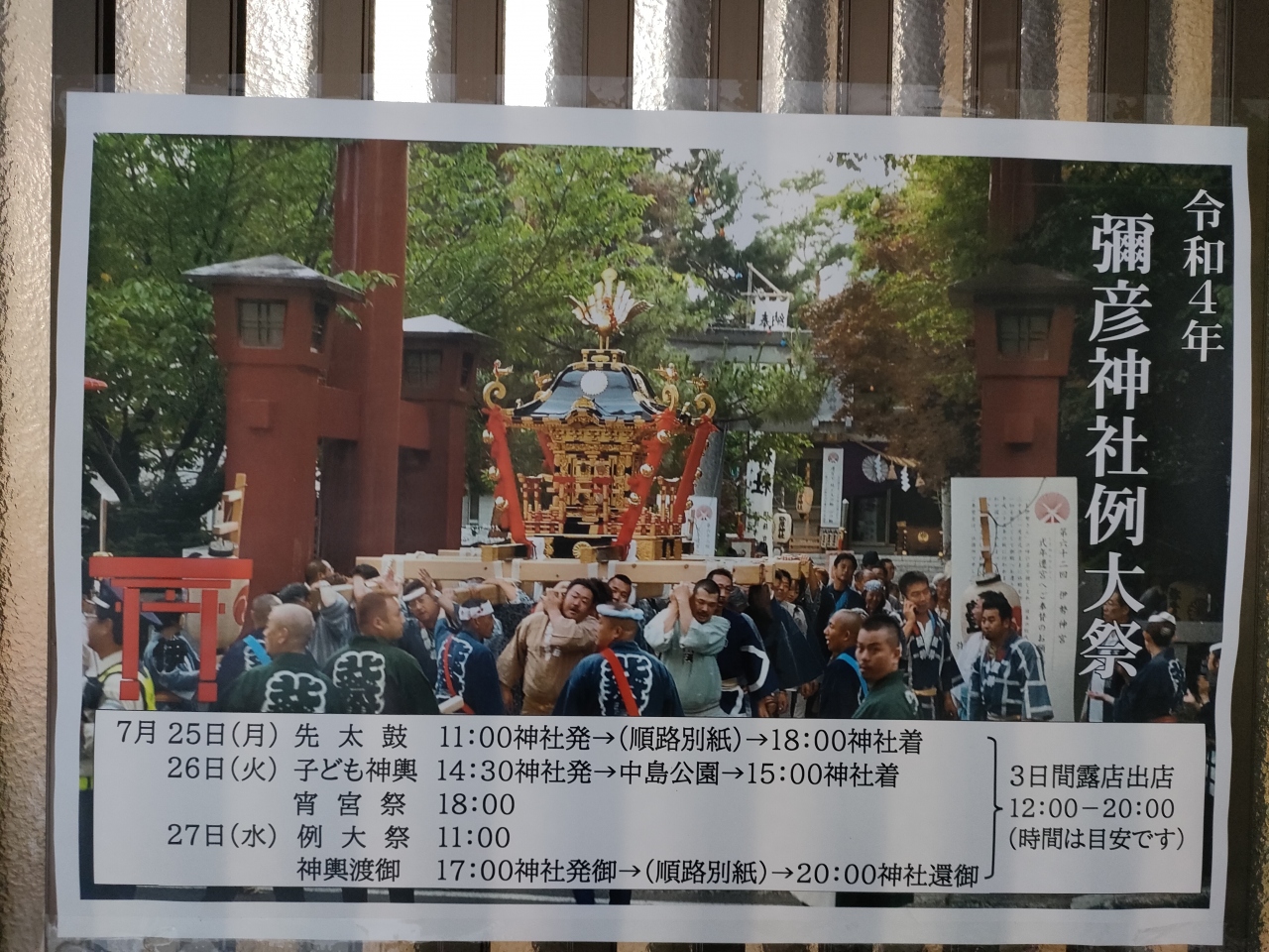 毎年7月27日に例大祭で、2022年のスケジュールでは25日に先太鼓、26日に子ども神輿、27日に神輿があります。