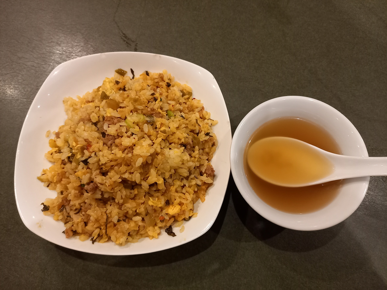 ビルの地下1階にあります。入口と出口が違います。オモウマイ店で紹介されてましたが、それだけでなくTVチャンピオンのチャーハン王大会でも優勝してました。腕は確かです。行った時は午後2時頃でしたが、満席でした。メニューはラーメンが600円から、チャーハンは680円からあります。今回は、高菜チャーハン750円をいただきました。量は普通盛りでもしっかりあり、味はピリ辛で、ご飯パラパラでした。営業終了時間前ですが、午後2時がラストオーダーなので注意してください。