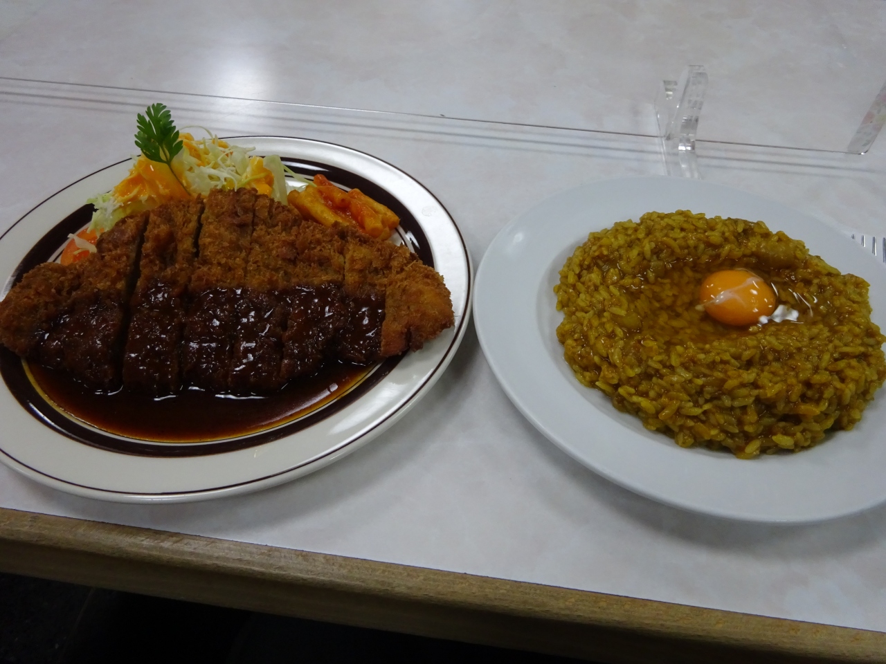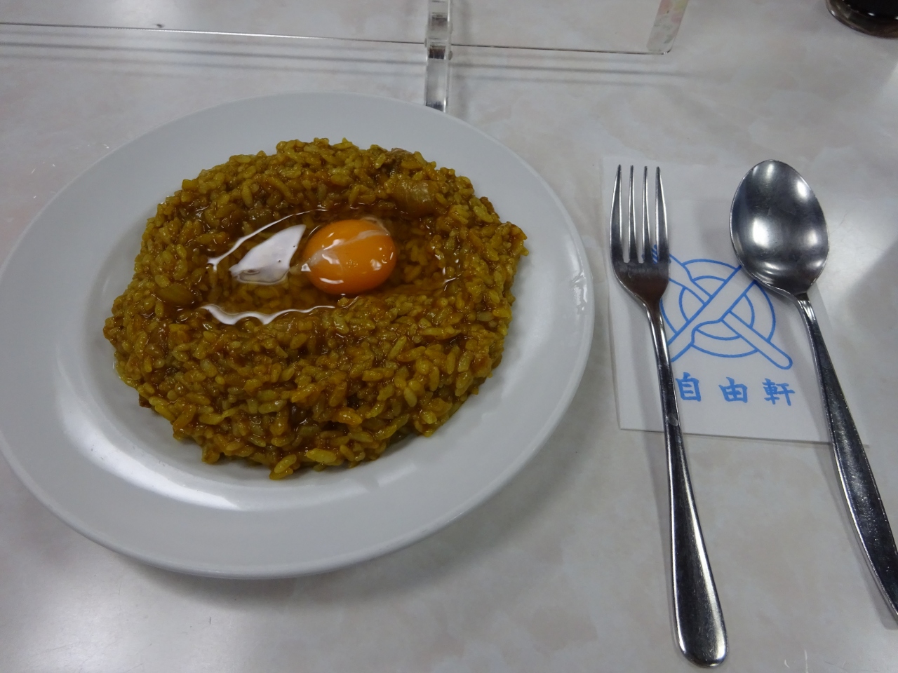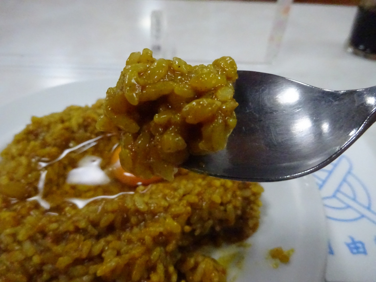 見ての通りルーが最初からご飯と混ざっているカレーで、それだけだと結構辛いです。生卵が乗っているので、混ぜるとマイルドな味に。さらにソースをかけて「味変」することもできます。ちなみに、カレーにソースをかけるという食べ方は、このお店が発祥なのだとか。