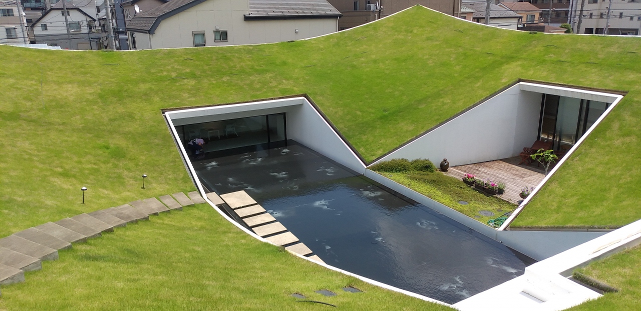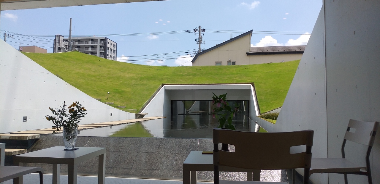 とにかく建物が素敵!変則的な2階建でrすが、展示スペースは基本的に1階部分です。外観からはそれとわからないのですが、中に入って見ると傾斜した芝生と幾何学的な池で構成されたモダンな中にはが望めます。