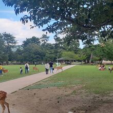 奈良公園のど真ん中にあります。目の前の緑地には多くの鹿がいました